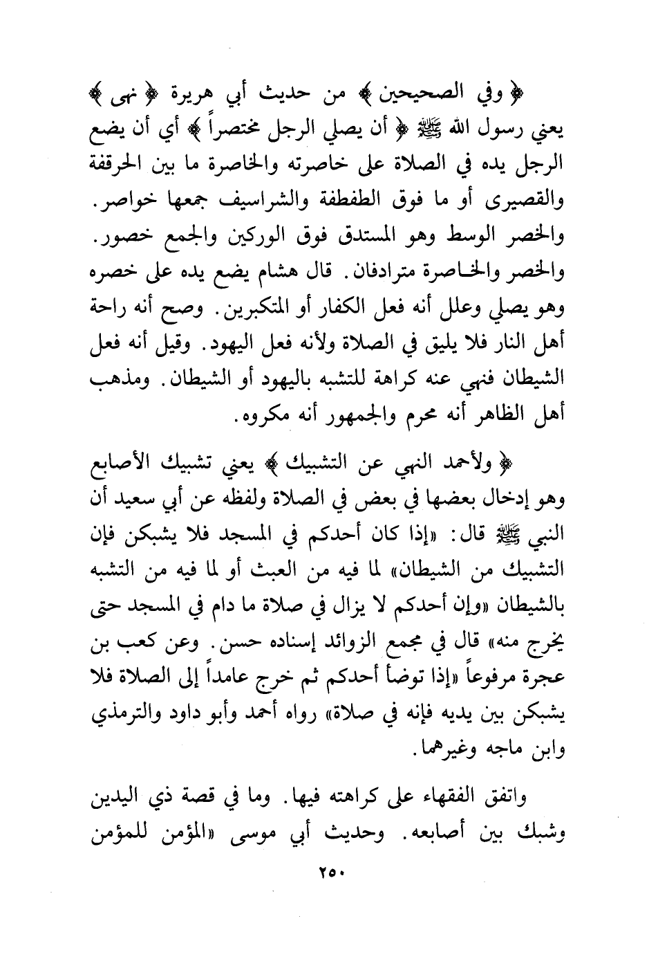 واتفق الفقهاء على كراهته فيها، وما في قصة ذي اليدين وشبك بين أصابعه، وحديث أبي موسى "المؤمن للمؤمن
