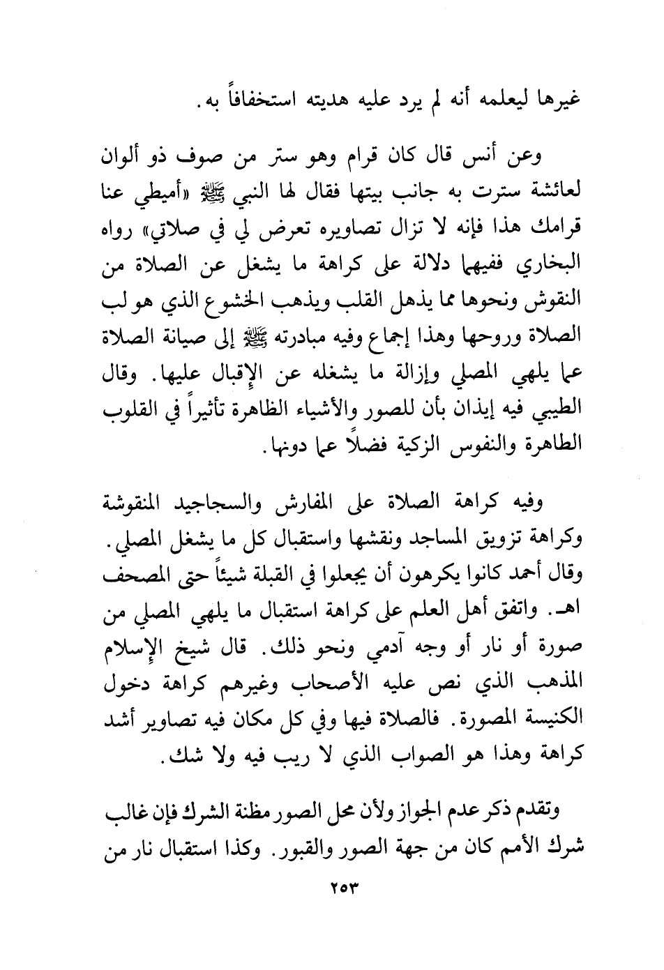 وعن أنس قال كان قرام وهو ستر من صوف ذو ألوان لعائشة سترت به جانب بيتها فقال لها النبي – - صلى الله عليه وسلم - "أميطي عنا قرامك هذا فإنه لا تزال تصاويره تعرض لي في صلاتي" رواه البخاري ففيهما دلالة على كراهة ما يشغل عن الصلاة من النقوش ونحوها مما يذهل القلب ويذهب الخشوع الذي هو لب الصلاة وروحها وهذا إجماع وفيه مبادرته - صلى الله عليه وسلم - إلى صيانة الصلاة عما يلهي المصلي وإزالة ما يشغله عن الإقبال عليها. وقال الطيبي فيه إيذان بأن للصور والأشياء الظاهرة تأثيرًا في القلوب الطاهرة والنفوس الزكية فضلاً عما دونهما.