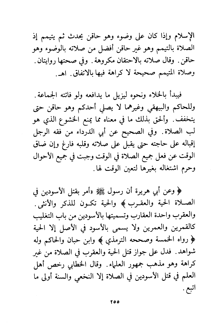 والعقرب واحدة العقارب وتسميتها بالأسودين من باب التغليب كالقمرين والعمرين ولا يسمى بالأسود في الأصل إلا الحية (رواه الخمسة وصححه الترمذي) وابن حبان والحكم وله شواهد. فدل على جواز قتل الحية والعقرب في الصلاة من غير كراهة وهو مذهب جمهور العلماء. وقال الخطابي رخص أهل العلم في قتل الأسودين في الصلاة إلا النخعي والسنة أولى ما اتبع.