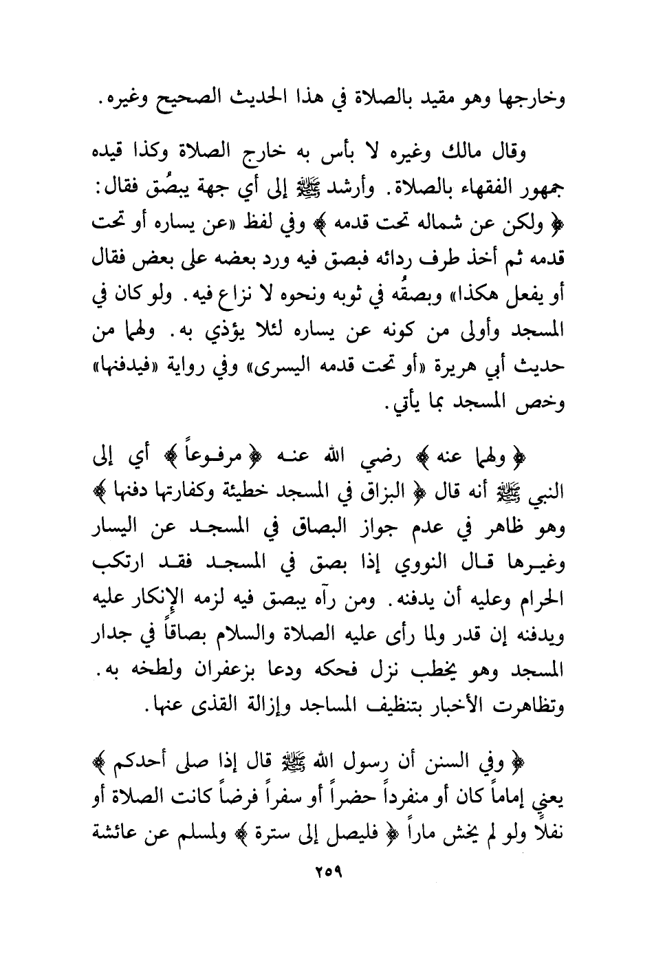 وقال مالك وغيره لا بأس به خارج الصلاة وكذا قيده جمهور الفقهاء بالصلاة. وأرشد – - صلى الله عليه وسلم - إلى أي جهة يبصق فقال: (ولكن عن شماله تحت قدمه) وفي لفظ "عن يساره أو تحت قدمه ثم أخذ طرف ردائه فبصق فيه ورد بعضه على بعض فقال أو يفعل هكذا" وبصقه في ثوبه ونحوه لا نزاع فيه. ولو كان في المسجد وأولى من كونه عن يساره لئلا يؤذي به. ولهما من حديث أبي هريرة "أو تحت قدمه اليسرى" وفي رواية "فيدفنها" وخص المسجد بما يأتي.