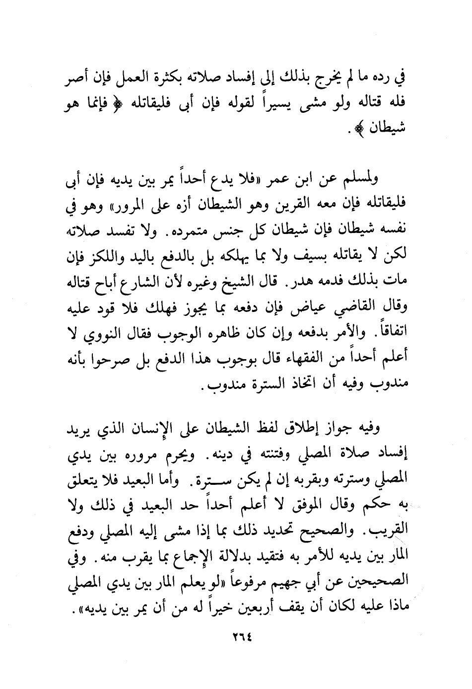 وفيه جواز إطلاق لفظ الشيطان على الإنسان الذي يريد إفساد صلاة المصلي وفتنته في دينه. ويحرم مروره بين يدي المصلي وسترته وبقربه إن لم يكن سترة. وأما البعيد فلا يتعلق به حكم وقال الموفق لا أعلم أحدًا حد البعيد في ذلك ولا القريب. والصحيح تحديد ذلك بما إذا مشى إليه المصلي ودفع المار بين يديه للأمر به فتقيد بدلالة الإجماع بما يقرب منه. وفي الصحيحين عن أبي جهيم مرفوعًا "لو يعلم المار بين يدي المصلي ماذا عليه لكان أن يقف أربعين خيرًا له من أن يمر بين يديه".