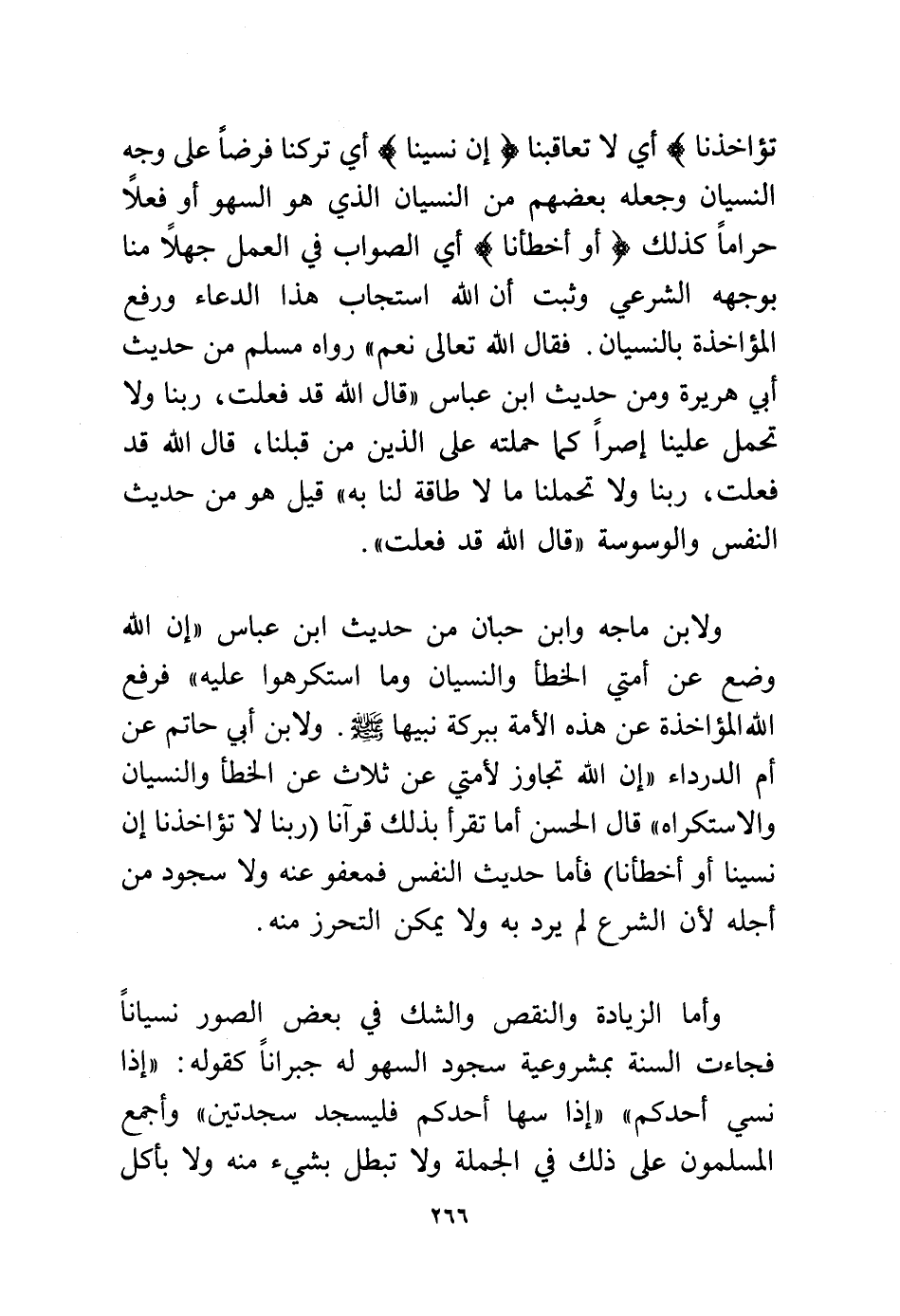 ولابن ماجه وابن حبان من حديث ابن عباس "إن الله وضع عن أمتي الخطأ والنسيان وما استكرهوا عليه" فرفع الله المؤاخذة عن هذه الأمة ببركة نبيها – - صلى الله عليه وسلم -. ولابن أبي حاتم عن أم الدرداء "إن الله تجاوز لأمتي عن ثلاث عن الخطأ والنسيان والاستكراه" قال الحسن أما تقرأ بذلك قرآنًا {رَبَّنَا لاَ تُؤَاخِذْنَا إِن نَّسِينَا أَوْ أَخْطَأْنَا} فأما حديث النفس فمعفو عنه ولا سجود من أجله لأن الشرع لم يرد به ولا يمكن التحرز منه.