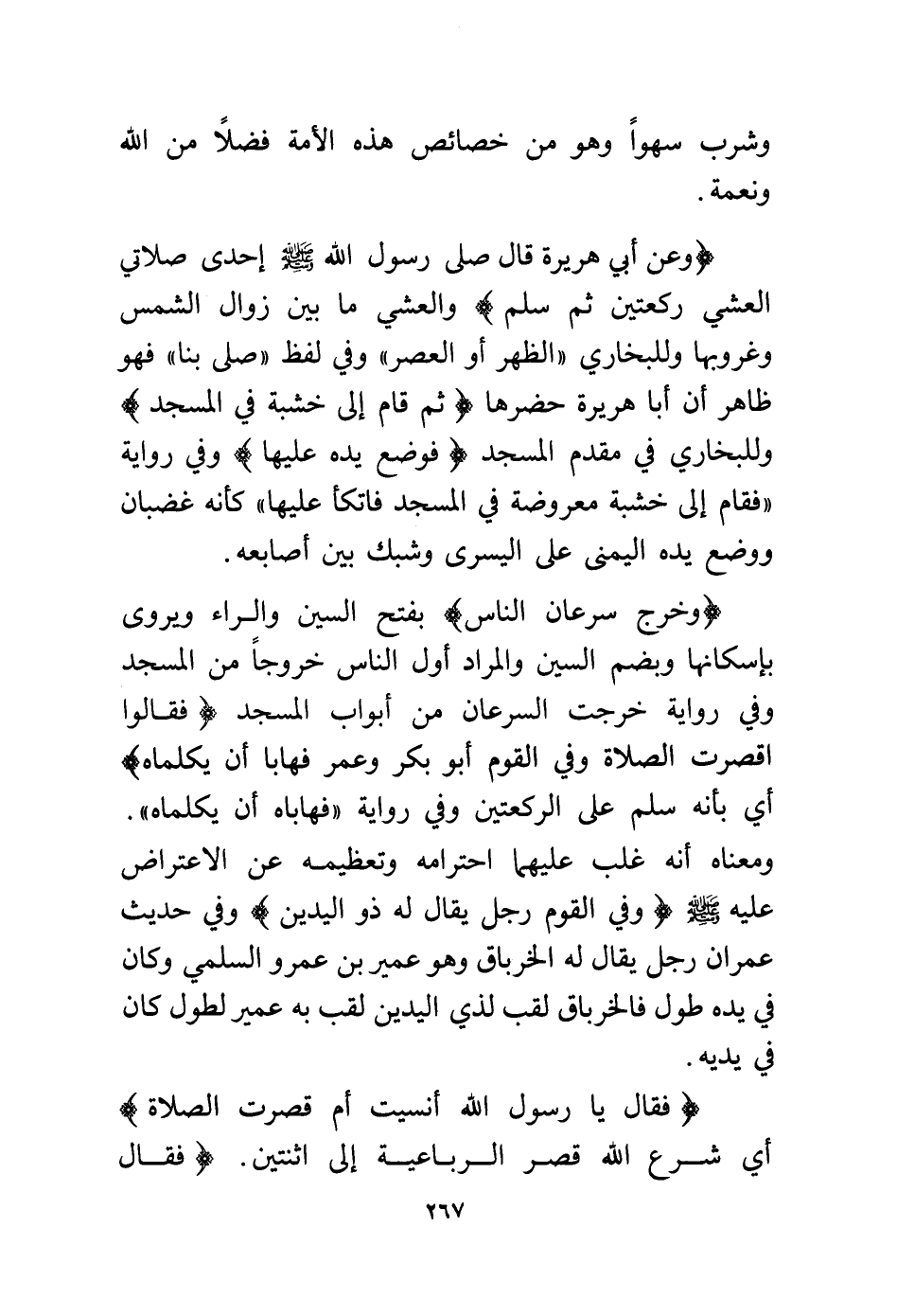 (وخرج سرعان الناس) بفتح السين والراء ويروى بإسكانها وبضم السين والمراد أول الناس خروجًا من المسجد وفي رواية خرجت السرعان من أبواب المسجد (فقالوا أقصرت الصلاة وفي القوم أبو بكر وعمر فهابا أن يكلماه) أي بأنه سلم على الركعتين وفي رواية "فهاباه أن يكلماه".