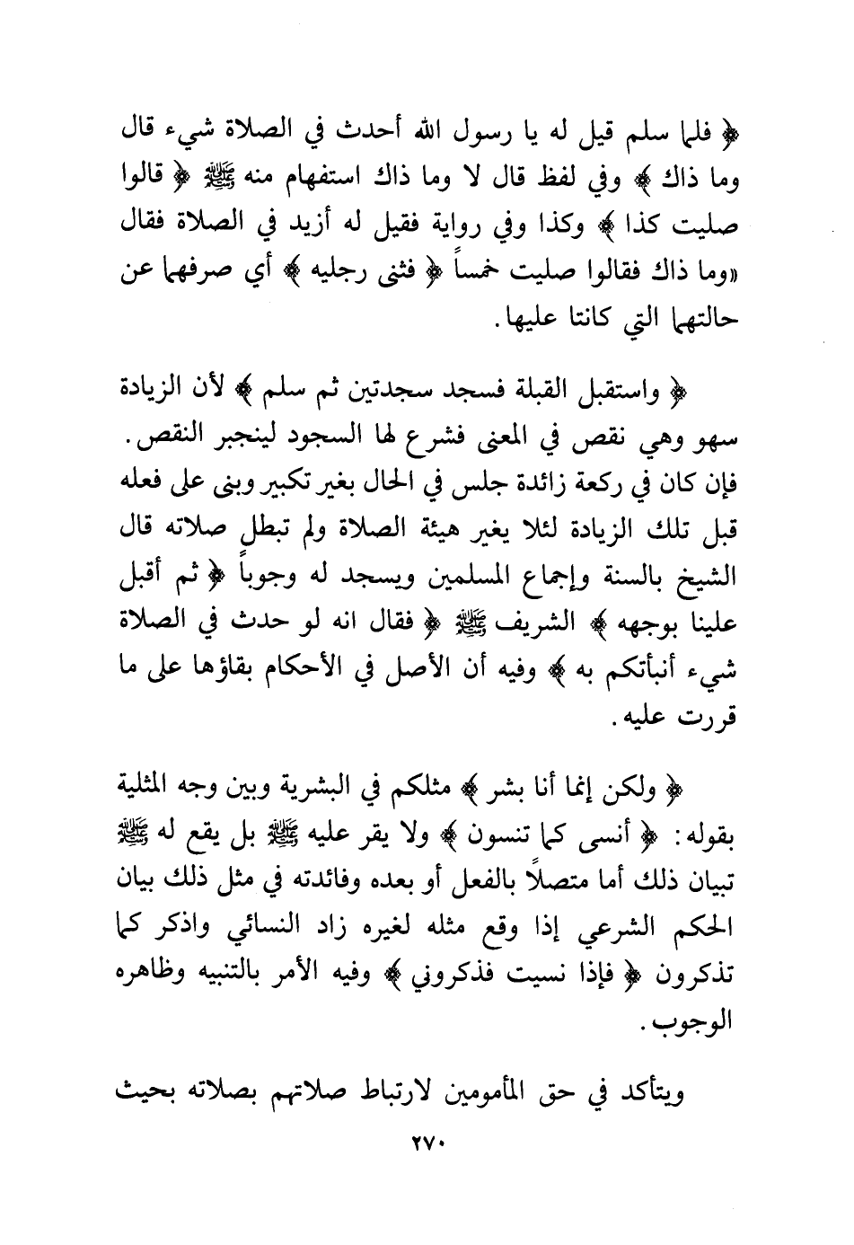فإن كان في ركعة زائدة جلس في الحال بغير تكبير وبنى على فعله قبل تلك الزيادة لئلا يغير هيئة الصلاة ولم تبطل صلاته قال الشيخ بالسنة وإجماع المسلمين ويسجد له وجوبًا (ثم أقبل علينا بوجهه) الشريف - صلى الله عليه وسلم - (فقال إنه لو حدث في الصلاة شيء أنبأتكم به) وفيه أن الأصل في الأحكام بقاؤها على ما قررت عليه.