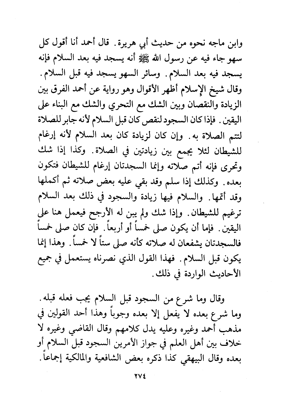 وقال شيخ الإسلام أظهر الأقوال وهو رواية عن أحمد الفرق بين الزيادة والنقصان وبين الشك مع التحري والشك مع البناء على اليقين. فإذا كان السجود لنقص كان قبل السلام لأنه جابر للصلاة لتتم الصلاة به، وإن كان لزيادة كان بعد السلام لأنه إرغام للشيطان لئلا يجمع بين زيادتين في الصلاة، وكذا إذا شك وتحرى فإنه أتم صلاته وإنما السجدتان إرغام للشيطان فتكون بعده. وكذلك إذا سلم وقد بقي عليه بعض صلاته ثم أكملها وقد أتمها والسلام فيها زيادة والسجود في ذلك بعد السلام ترغيم للشيطان. وإذا شك ولم يبن له الأرجح فيعمل هنا على اليقين. فإما أن يكون صلى خمسًا أو أربعًا. فإن كان صلى خمسًا فالسجدتان يشفعان له صلاته كأنه صلى ستًا لا خمسًا. وهذا إنما يكون قبل السلام. فهذا القول الذي نصرناه يستعمل في جميع الأحاديث الواردة في ذلك.
