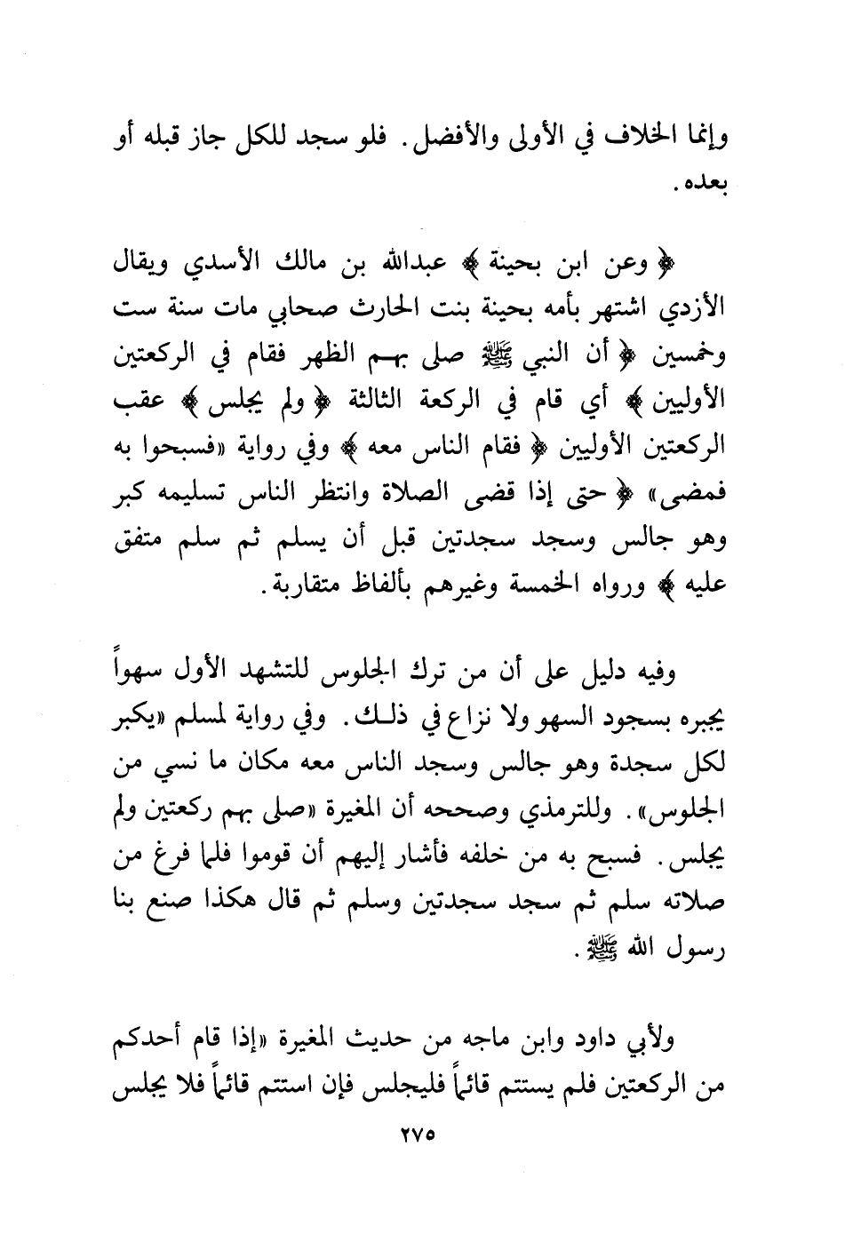 (وعن ابن بحينه) عبد الله بن مالك الأسدي ويقال الأزدي اشتهر بأمه بحينة بنت الحارث صحابي مات سنة ست وخمسين (أن النبي - صلى الله عليه وسلم - صلى بهم الظهر فقام في الركعتين الأوليين) أي قام في الركعة الثالثة (ولم يجلس) عقب الركعتين الأوليين (فقام الناس معه) وفي رواية "فسبحوا به فمضى" (حتى إذا قضى الصلاة وانتظر الناس تسليمه كبر وهو جالس وسجد سجدتين قبل أن يسلم ثم سلم متفق عليه) ورواه الخمسة وغيرهم بألفاظ متقاربة.