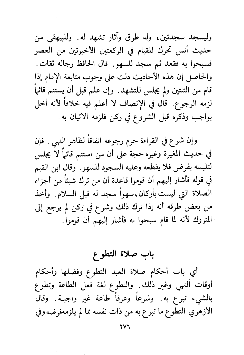 والحاصل إن هذه الأحاديث دلت على وجوب متابعة الإمام إذا قام من الثنتين ولم يجلس للتشهد. وإن علم قبل أن يستتم قائمًا لزمه الرجوع. قال في الإنصاف لا أعلم فيه خلافًا لأنه أخل بواجب وذكره قبل الشروع في ركن فلزمه الإتيان به.