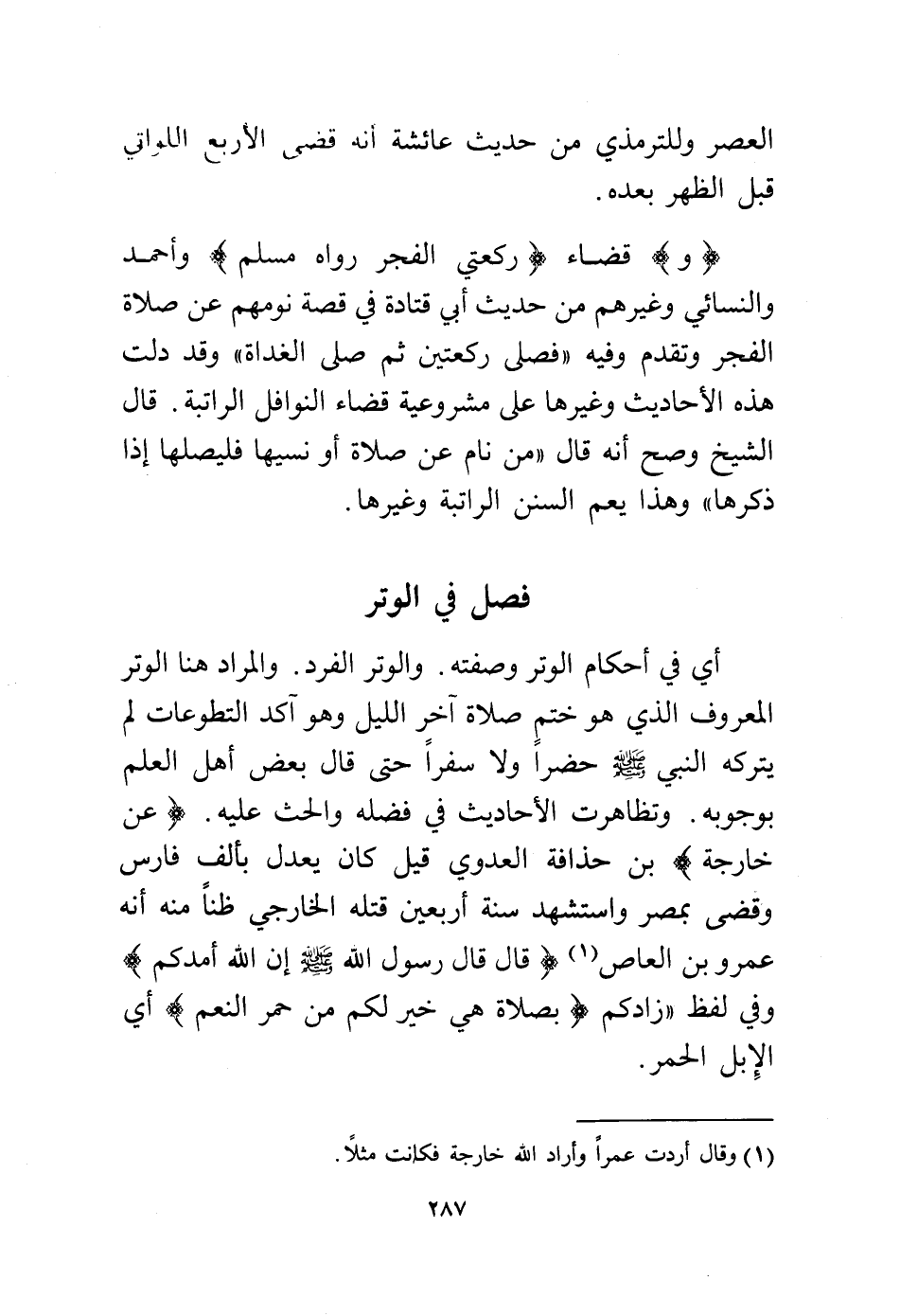 أي في أحكام الوتر وصفته. والوتر الفرد. والمراد هنا الوتر المعروف الذي هو ختم صلاة آخر الليل وهو آكد التطوعات لم يتركه النبي - صلى الله عليه وسلم - حضراً ولا سفراً حتى قال بعض أهل العلم بوجوبه. وتظاهرت الأحاديث في فضله والحث عليه (وعن خارجة) بن حذافة العدوي قيل كان يعدل بألف فارس وقضى بمصر واستشهد سنة أربعين قتله الخارجي ظناً منه أنه عمرو بن العاص (¬1) (قال قال رسول الله - صلى الله عليه وسلم - إن الله أمدكم) وفي لفظ "زادكم (بصلاة هي خير لكم من حمر النعم) أي الإبل الحمر.