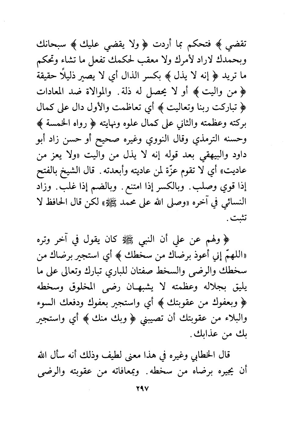 تقضي) فتحكم بما أردت (ولا يقضي عليك) سبحانك وبحمدك لا راد لأمرك ولا معقب لحكمك تفعل ما تشاء وتحكم ما تريد (إنه لا يذل) بكسر الذال أي لا يصير ذليلاً حقيقة (من واليت) أو لا يحصل له ذلة. والموالاة ضد المعادات (تباركت ربنا وتعاليت) أي تعاظمت والأول دال على كمال بركته وعظمته والثاني على كمال علوه ونهايته (رواه الخمسة) وحسنه الترمذي وقال النووي وغيره صحيح أو حسن زاد أبو داود والبيهقي بعد قوله بعد قوله إنه لا يذل من واليت "ولا يعز من عاديت" أي لا تقوم عزة لمن عاديته وأبعدته. قال الشيخ بالفتح إذا قوي وصلب. وبالكسر إذا امتنع، وبالضم إذا غلب. وزاد النسائي في آخره "وصلى الله على محمد - صلى الله عليه وسلم - " لكن قال الحافظ لا تثبت.