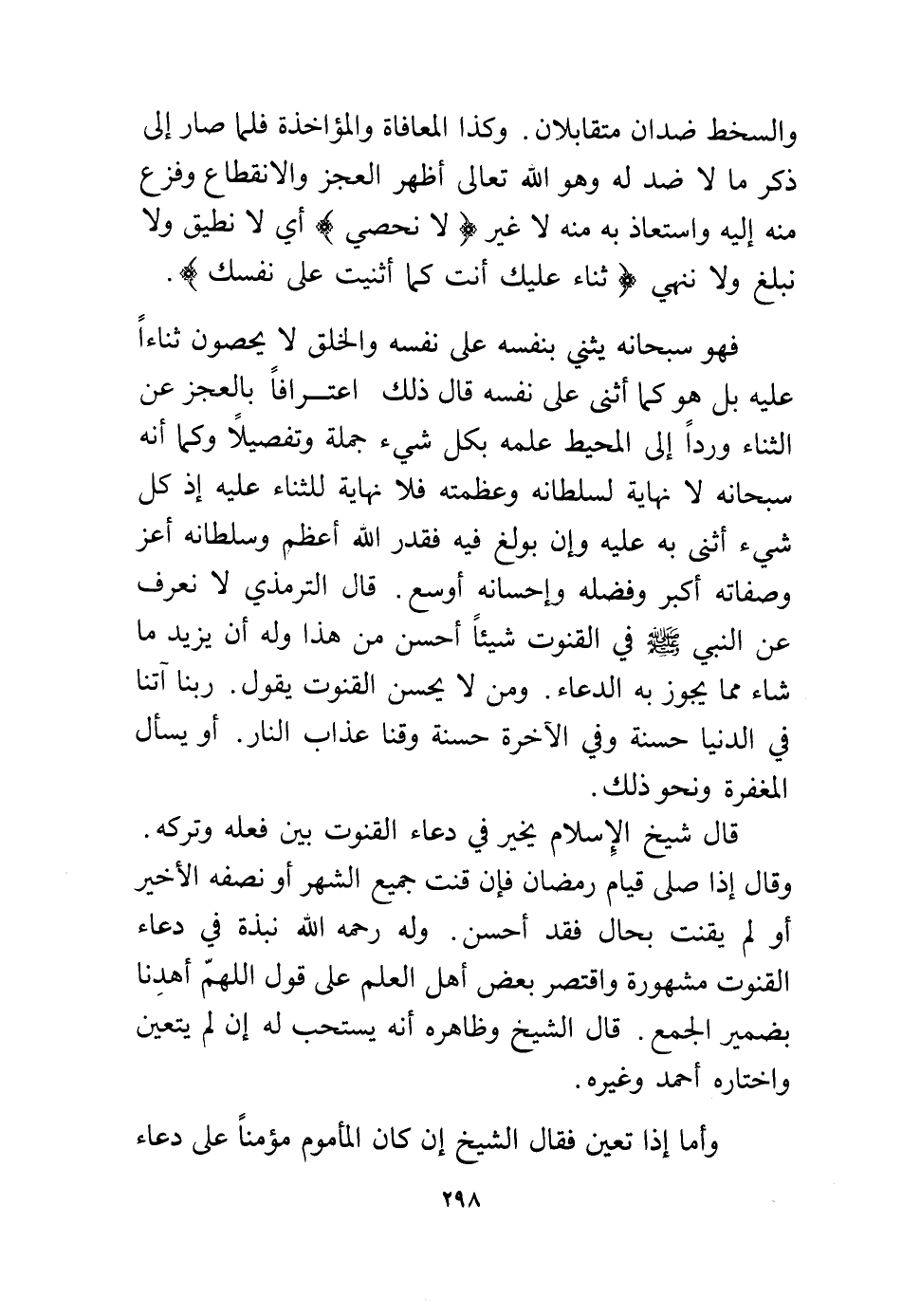 فهو سبحانه يثني بنفسه على نفسه والخلق لا يحصون ثناءًا عليه بل هو كما أثنى على نفسه قال ذلك اعترافًا بالعجز عن الثناء وردًا إلى المحيط علمه بكل شيء جملة وتفصيلاً وكما أنه سبحانه لا نهاية لسلطانه وعظمته فلا نهاية للثناء عليه إذ كل شيء أثنى به عليه وإن بولغ فيه فقدر الله أعظم وسلطانه أعز وصفاته أكبر وفضله وإحسانه أوسع. قال الترمذي لا نعرف عن النبي - صلى الله عليه وسلم - في القنوت شيئًا أحسن من هذا وله أن يزيد ما شاء مما يجوز به الدعاء. ومن لا يحسن القنوت يقول. ربنا آتنا في الدنيا حسنة وفي الآخرة حسنة وقنا عذاب النار. أو يسأل المغفرة ونحو ذلك.