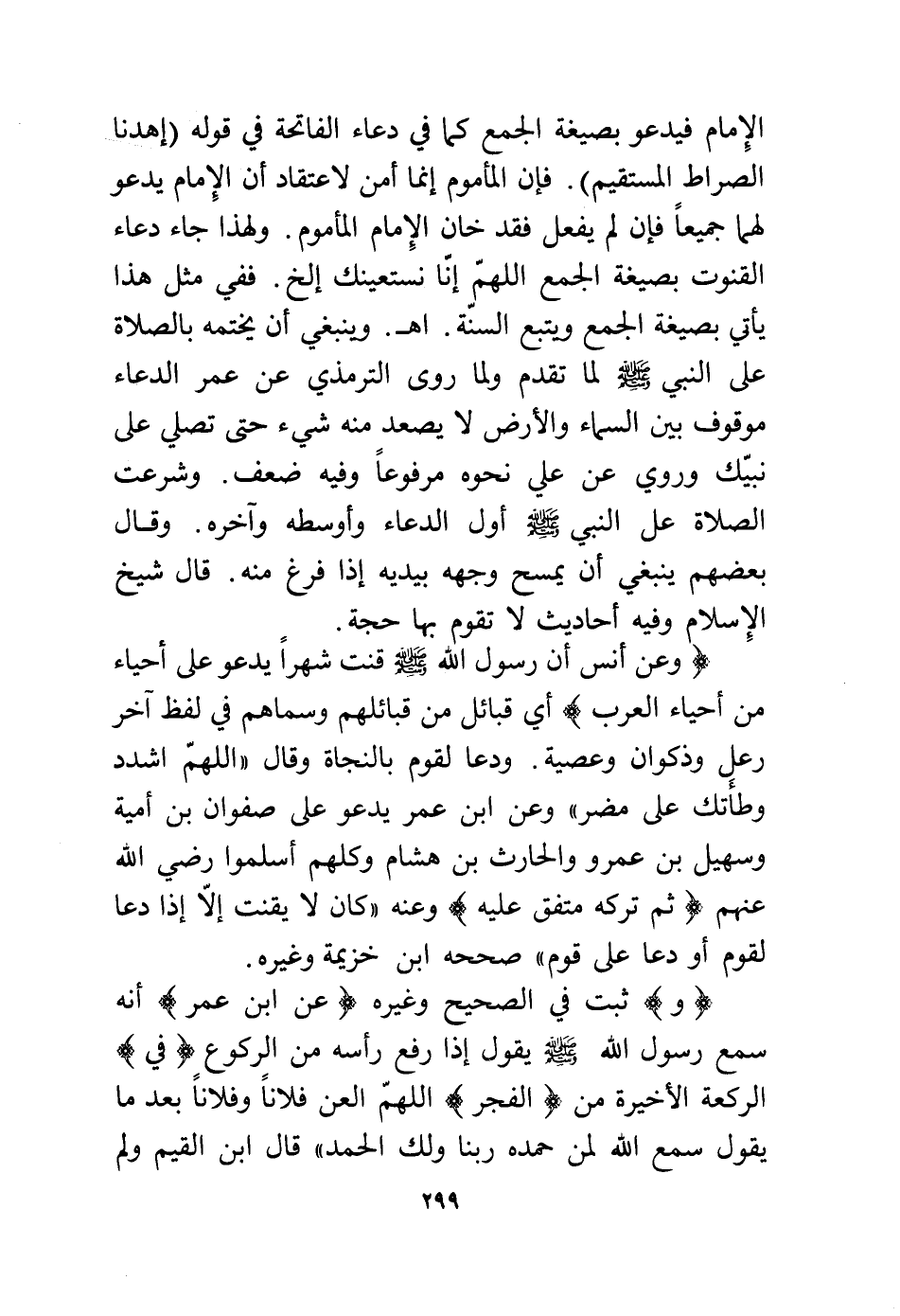 الإمام فيدعو بصيغة الجمع كما في دعاء الفاتحة في قوله (إهدنا الصراط المستقيم) فإن المأموم إنما أمن لاعتقاد أن الإمام يدعو لهما جميعًا فإن لم يفعل فقد خان الإمام المأموم، ولهذا جاء دعاء القنوت بصيغة الجمع اللهم إنا نستعينك إلخ. ففي مثل هذا يأتي بصيغة الجمع ويتبع السنة. اهـ. وينبغي أن يختمه بالصلاة على النبي - صلى الله عليه وسلم - لما تقدم ولما روي الترمذي عن عمر الدعاء موقوف بين السماء والأرض لا يصعد منه شيء حتى تصلي على نبيك وروى عن علي نحوه مرفوعًا وفيه ضعيف وشرعت الصلاة على النبي - صلى الله عليه وسلم - أول الدعاء وأوسطه وآخره. وقال بعضهم ينبغي أن يمسح وجهه بيديه إذا فرغ منه. قال شيخ الإسلام وفيه أحاديث لا تقوم بها حجة.