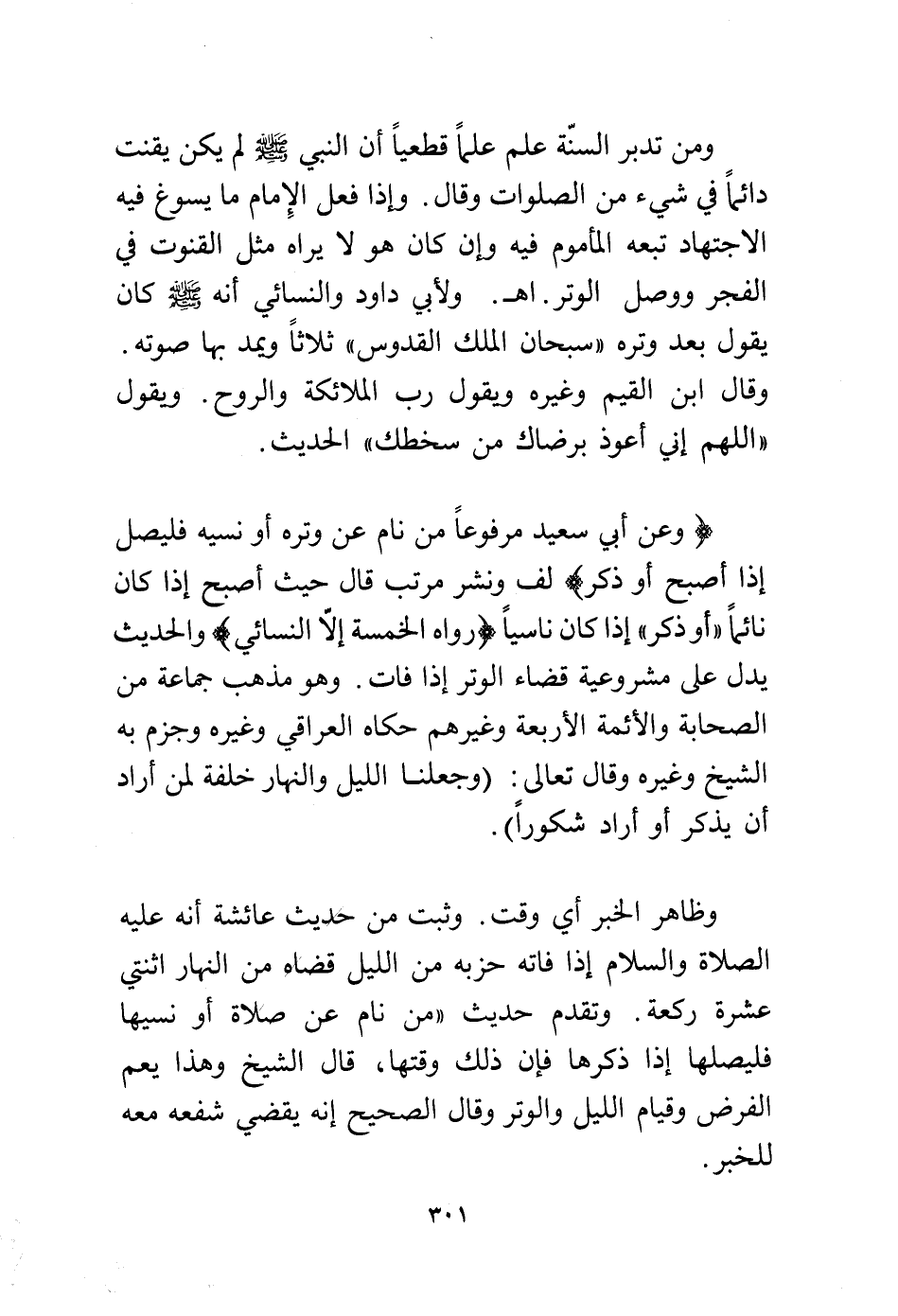 ومن تدبر السنة علم علمًا قطعيًا أن النبي - صلى الله عليه وسلم - لم يكن يقنت دائمًا في شيء من الصلوات وقال. وإذا فعل الإمام ما يسوغ فيه الاجتهاد تبعه المأموم فيه وإن كان هو لا يراه مثل القنوت في الفجر ووصل الوتر. اهـ. ولأبي داود والنسائي أنه - صلى الله عليه وسلم - كان يقول بعد وتره "سبحان الملك القدوس" ثلاثًا ويمد بها صوته.