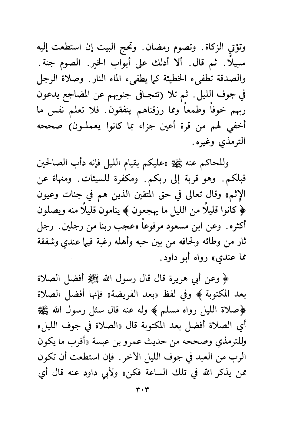 وتؤتي الزكاة. وتصوم رمضان. وتحج البيت إن استطعت إليه سبيلاً. ثم قال. ألا أدلك على أبواب الخير. الصوم جنة. والصدقة تطفئ الخطيئة كما يطفئ الماء النار. وصلاة الرجل في جوف الليل. ثم تلا {تَتَجَافَى جُنُوبُهُمْ عَنِ الْمَضَاجِعِ يَدْعُونَ رَبَّهُمْ خَوْفًا وَطَمَعًا وَمِمَّا رَزَقْنَاهُمْ يُنفِقُون فَلاَ تَعْلَمُ نَفْسٌ مَّا أُخْفِيَ لَهُم مِّن قُرَّةِ أَعْيُنٍ جَزَاء بِمَا كَانُوا يَعْمَلُون} صححه الترمذي وغيره.