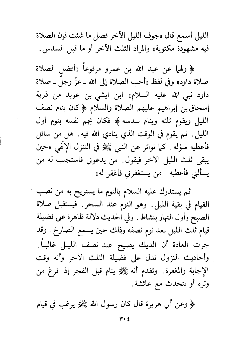 (ولهما عن عبد الله بن عمرو مرفوعًا "أفضل الصلاة صلاة داود" وفي لفظ "أحب الصلاة إلى الله –عز وجل- صلاة داود" نبي الله عليه السلام" ابن ايشي بن عوبد من ذرية إسحاق بن إبراهيم عليهم الصلاة والسلام (كان ينام نصف الليل ويقوم ثلثه وينام سدسه) فكان يجم نفسه بنوم أول الليل. ثم يقوم في الوقت الذي ينادي الله فيه. هل من سائل فأعطيه سؤله. كما تواتر عن النبي - صلى الله عليه وسلم - في التنزل الإلهي "حين يبقى ثلث الليل الآخر فيقول. من يدعوني فاستجيب له من يسألني فأعطيه. من يستغفرني فأغفر له".