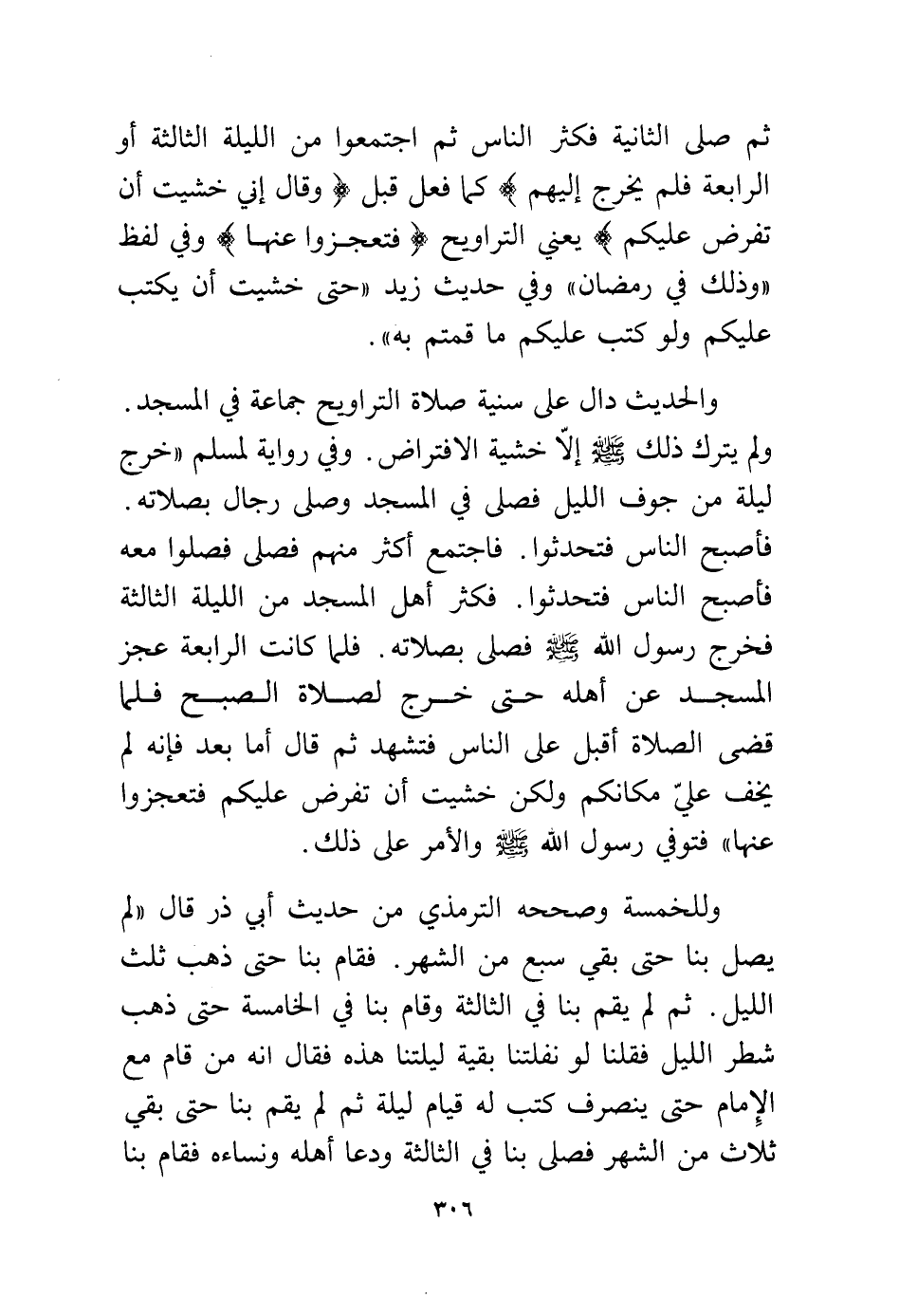 فأصبح الناس فتحدثوا. فاجتمع أكثر منهم فصلى فصلوا معه فأصبح الناس فتحدثوا. فكثر أهل المسجد من الليلة الثالثة فخرج رسول الله - صلى الله عليه وسلم - فصلى بصلاته. فلما كانت الرابعة عجز المسجد عن أهله حتى خرج لصلاة الصبح فلما قضى الصلاة أقبل على الناس فتشهد ثم قال أما بعد فإنه لم يخف علي مكانكم ولكن خشيت أن تفرض عليكم فتعجزوا عنها" فتوفي رسول الله - صلى الله عليه وسلم - والأمر على ذلك.