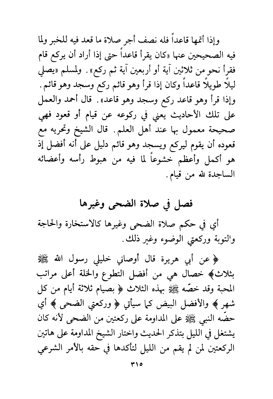(عن أبي هريرة قال أوصاني خليلي رسول الله - صلى الله عليه وسلم - بثلاث) خصال هي من أفضل التطوع والخلة أعلى مراتب المحبة وقد خصه - صلى الله عليه وسلم - بهذه الثلاث (بصيام ثلاثة أيام من كل شهر) والأفضل البيض كما سيأتي (وركعتي الضحى) أي حضه النبي - صلى الله عليه وسلم - على المداومة على ركعتين من الضحى لأنه كان يشتغل في الليل بتذكر الحديث واختار الشيخ المداومة على هاتين الركعتين