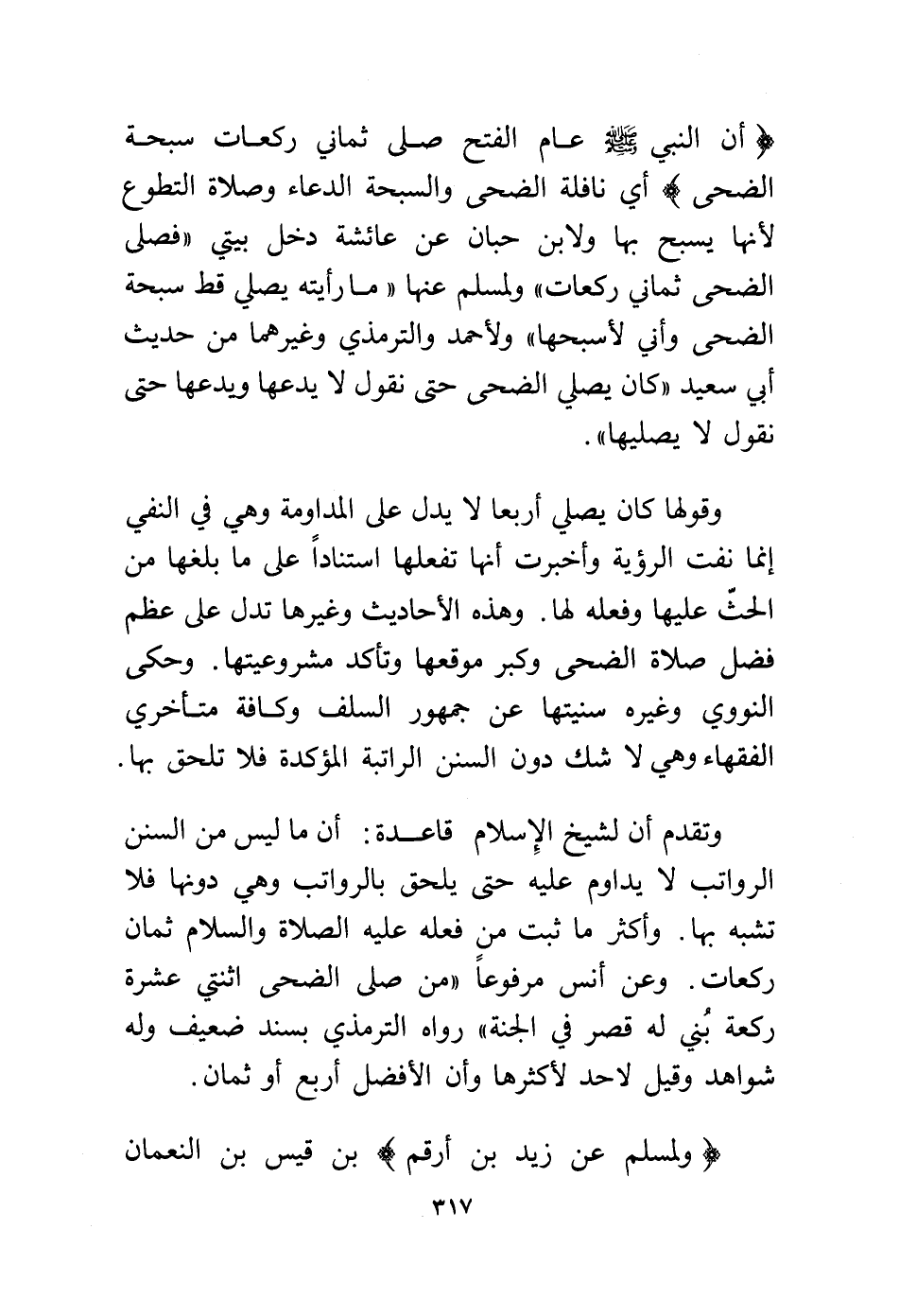 وتقدم أن لشيخ الإسلام قاعدة: أن ما ليس من السنن الرواتب لا يداوم عليه حتى يلحق بالرواتب وهي دونها فلا تشبه بها, وأكثر ما ثبت من فعله عليه الصلاة والسلام ثمان ركعات. وعن أنس مرفوعًا "من صلى الضحى اثنتي عشرة ركعة بني له قصر في الجنة" رواه الترمذي بسند ضعيف وله شواهد وقيل لأحد لأكثرها وأن الأفضل أربع أو ثمان.