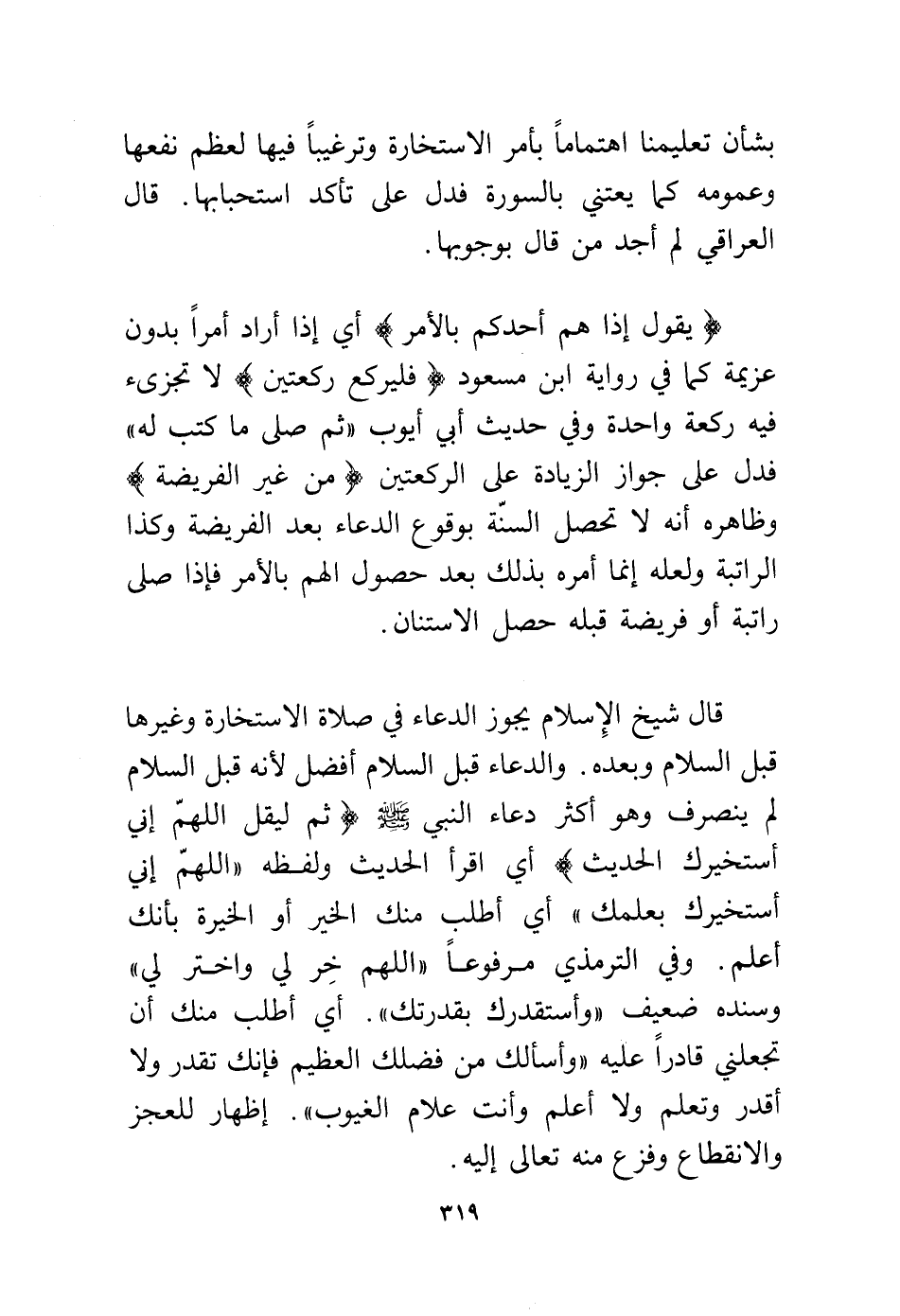قال شيخ الإسلام يجوز الدعاء في صلاة الاستخارة وغيرها قبل السلام وبعده. والدعاء قبل السلام أفضل لأنه قبل السلام لم ينصرف وهو أكثر دعاء النبي - صلى الله عليه وسلم - (ثم ليقل اللهم إني أستخيرك الحديث) أي اقرأ الحديث، ولفظه "اللهم إني أستخيرك بعلمك" أي أطلب منك الخير أو الخيرة بأنك أعلم. وفي الترمذي مرفوعًا "اللهم خر لي واختر لي" وسنده ضعيف "وأستقدرك بقدرتك" أي أطلب منك أن تجعلني قادرًا عليه "وأسألك من فضلك العظيم فإنك تقدر ولا أقدر وتعلم ولا أعلم وأنت علام الغيوب". إظهار للعجز والانقطاع وفزع منه تعالى إليه.