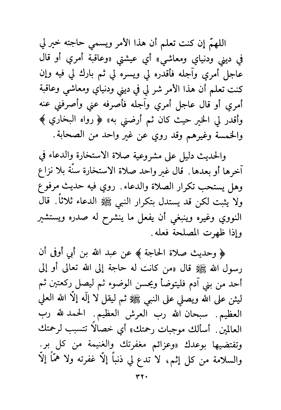اللهم إن كنت تعلم أن هذا الأمر ويسمي حاجته خير لي في ديني ودنياي ومعاشي" أي عيشتي "وعاقبة أمري أو قال عاجل أمري، وآجله فأقدره لي ويسره لي ثم بارك لي فيه وإن كنت تعلم أن هذا الأمر شر لي في ديني ودنياي ومعاشي وعاقبة أمري أو قال عاجل أمري وآجله فأصرفه عني وأصرفني عنه وأقدر لي الخير حيث كان ثم أرضني به" (رواه البخاري) والخمسة وغيرهم وقد روي عن غير واحد من الصحابة.