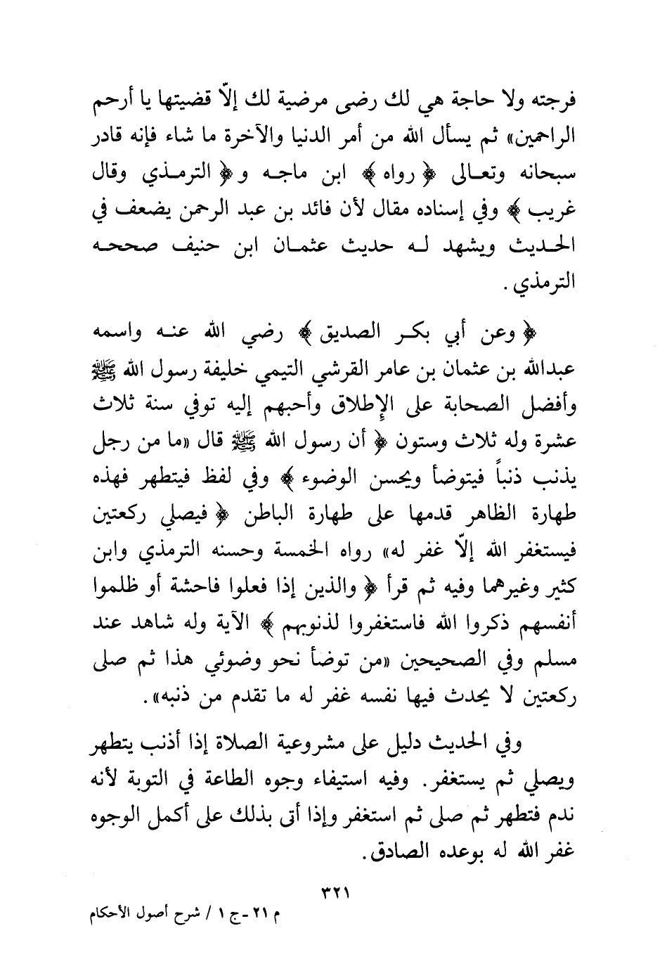 (وعن أبي بكر الصديق) رضي الله عنه واسمه عبد الله بن عثمان بن عامر القرشي التيمي خليفة رسول الله - صلى الله عليه وسلم - وأفضل الصحابة على الإطلاق وأحبهم إليه توفي سنة ثلاث عشرة وله ثلاث وستون (أن رسول الله - صلى الله عليه وسلم - قال "ما من رجل يذنب ذنبًا فيتوضأ ويحسن الوضوء) وفي لفظ فيتطهر فهذه طهارة الظاهر قدمها على طهارة الباطن (فيصلي ركعتين فيستغفر الله إلا غفر له" رواه الخمسة وحسنه الترمذي وابن كثير وغيرهما وفيه ثم قرأ {وَالَّذِينَ إِذَا فَعَلُواْ فَاحِشَةً أَوْ ظَلَمُواْ أَنْفُسَهُمْ ذَكَرُواْ اللهَ فَاسْتَغْفَرُواْ لِذُنُوبِهِمْ} الآية وله شاهد عند مسلم وفي الصحيحين "من توضأ نحو وضوئي هذا ثم صلى ركعتين لا يحدث فيها نفسه غفر له ما تقدم من ذنبه".