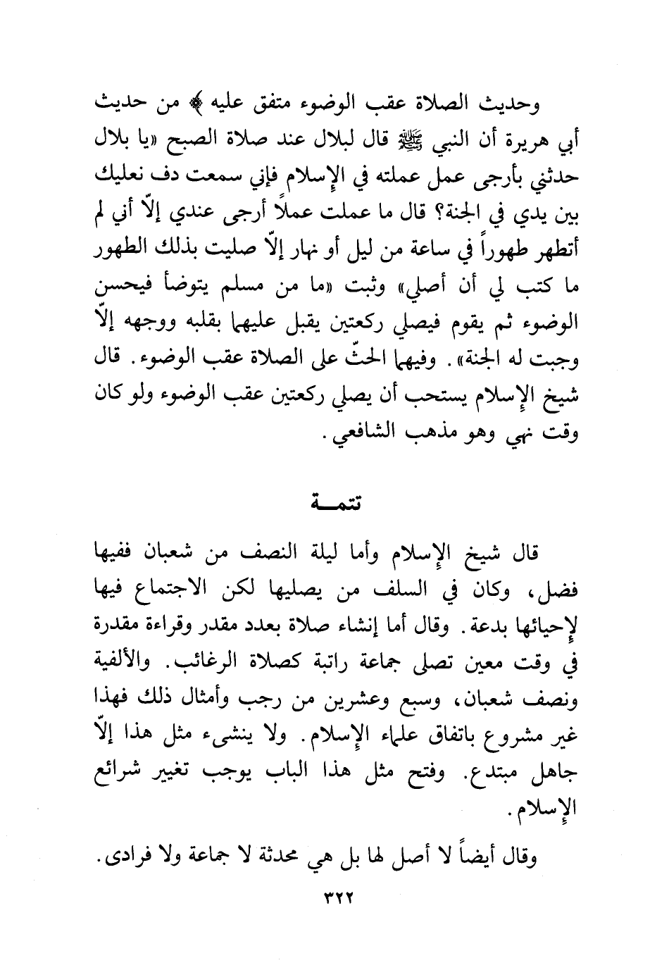 قال شيخ الإسلام وأما ليلة النصف من شعبان ففيها فضل، وكان في السلف من يصليها لكن الاجتماع فيها لإحيائها بدعة. وقال أما إنشاء صلاة بعدد مقدر وقراءة مقدرة في وقت معين تصلي جماعة راتبة كصلاة الرغائب. والألفية ونصف شعبان، وسبع وعشرين من رجب وأمثال ذلك فهذا غير مشروع باتفاق علماء الإسلام. ولا ينشئ مثل هذا إلا جاهل مبتدع، وفتح مثل هذا الباب يوجب تغيير شرائع الإسلام.