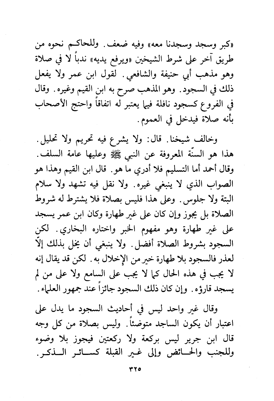 وقال أحمد أما التسليم فلا أدري ما هو. قال ابن القيم وهذا هو الصواب الذي لا ينبغي غيره. ولا نقل فيه تشهد ولا سلام البتة ولا جلوس. وعلى هذا فليس بصلاة فلا يشترط له شروط الصلاة بل يجوز وإن كان على غير طهارة وكان ابن عمر يسجد على غير طهارة وهو مفهوم الخبر واختاره البخاري. لكن السجود بشروط الصلاة أفضل. ولا ينبغي أن يخل بذلك إلا لعذر فالسجود بشروط الصلاة أفضل. ولا ينبغي أن يخل بذلك إلا لعذر فالسجود بلا طهارة خير من الإخلال به. لكن قد يقال إنه لا يجب في هذه الحال كما لا يجب على السامع ولا على من لم يسجد قارؤه. وإن كان ذلك السجود جائزًا عند جمهور العلماء.