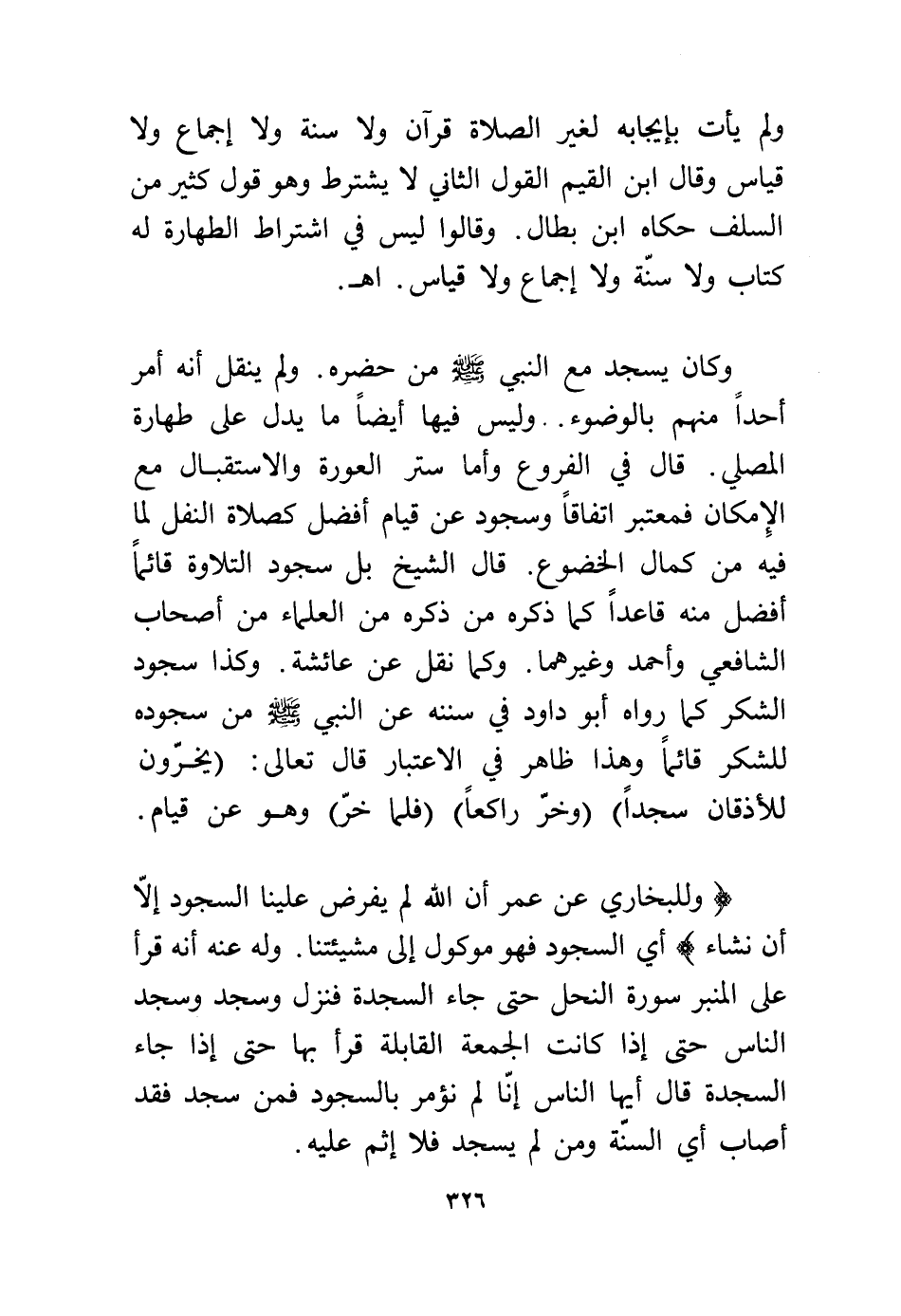 وكان يسجد مع النبي - صلى الله عليه وسلم - من حضره. ولم ينقل أنه أمر أحدًا منهم بالوضوء. وليس فيها أيضًا ما يدل على طهارة المصلي. قال في الفروع وأما ستر العورة والاستقبال مع الإمكان فمعتبر اتفاقًا وسجود عن قيام أفضل كصلاة النفل لما فيه من كمال الخضوع. قال الشيخ بل سجود التلاوة قائمًا أفضل منه قاعدًا كما ذكره من ذكره من العلماء من أصحاب الشافعي وأحمد وغيرهما. وكما نقل عن عائشة. وكذا سجود الشكر كما رواه أبو داود في سننه عن النبي - صلى الله عليه وسلم - من سجوده للشكر قائمًا وهذا ظاهر في الاعتبار قال تعالى: {يَخِرُّونَ لِلأَذْقَانِ سُجَّدًا} {وَخَرَّ رَاكِعًا} {فَلَمَّا خَرَّ} وهو عن قيام.