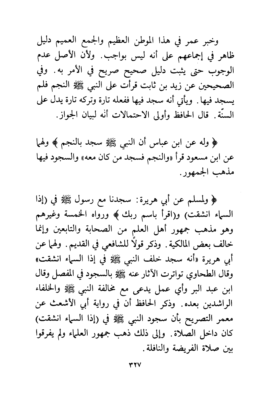 (ولمسلم عن أبي هريرة: سجدنا مع رسول الله - صلى الله عليه وسلم - في (إذا السماء انشقت) و (اقرأ باسم ربك) ورواه الخمسة وغيرهم وهو مذهب جمهور أهل العلم من الصحابة والتابعين وإنما خالف بعض المالكية. وذكر قولاً للشافعي في القديم، ولهما عن أبي هريرة "أنه سجد خلف النبي - صلى الله عليه وسلم - في إذا السماء انشقت" وقال الطحاوي تواترت الآثار عنه - صلى الله عليه وسلم - بالسجود في المفصل وقال ابن عبد البر وأي عمل يدعى مع مخالفة النبي –صلى الله عليه وسلم- والخلفاء الراشدين بعده. وذكر الحافظ أن في رواية أبي الأشعث عن معمر التصريح بأن سجود النبي - صلى الله عليه وسلم - في (إذا السماء انشقت) كان داخل الصلاة. وإلى ذلك ذهب جمهور العلماء ولم يفرقوا بين صلاة الفريضة والنافلة.