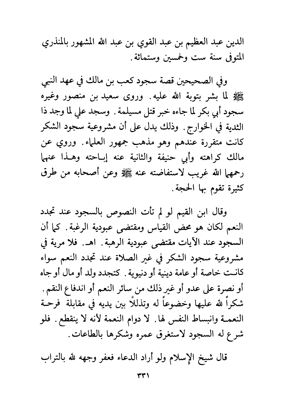 وقال ابن القيم لو لم تأت النصوص بالسجود عند تجدد النعم لكان هو محض القياس ومقتضى عبودية الرغبة. كما أن السجود عند الآيات مقتضي عبودية الرهبة. اهـ. فلا مرية في مشروعية سجود الشكر في غير الصلاة عند تجدد النعم سواء كانت خاصة أو عامة دينية أو دنيوية. كتجدد ولد أو مال أو جاه أو نصرة على عدو أو غير ذلك من سائر النعم أو اندفاع النقم.