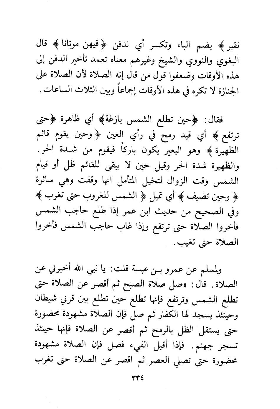 ولمسلم عن عمرو بن عبسة قلت: يا نبي الله أخبرني عن الصلاة. قال: "صل صلاة الصبح ثم أقصر عن الصلاة حتى تطلع الشمس وترتفع فإنها تطلع حين تطلع بين قرني شيطان وحينئذ يسجد لها الكفار ثم صل فإن الصلاة مشهودة محضورة حتى يستقل الظل بالرمح ثم أقصر عن الصلاة فإنها حينئذ