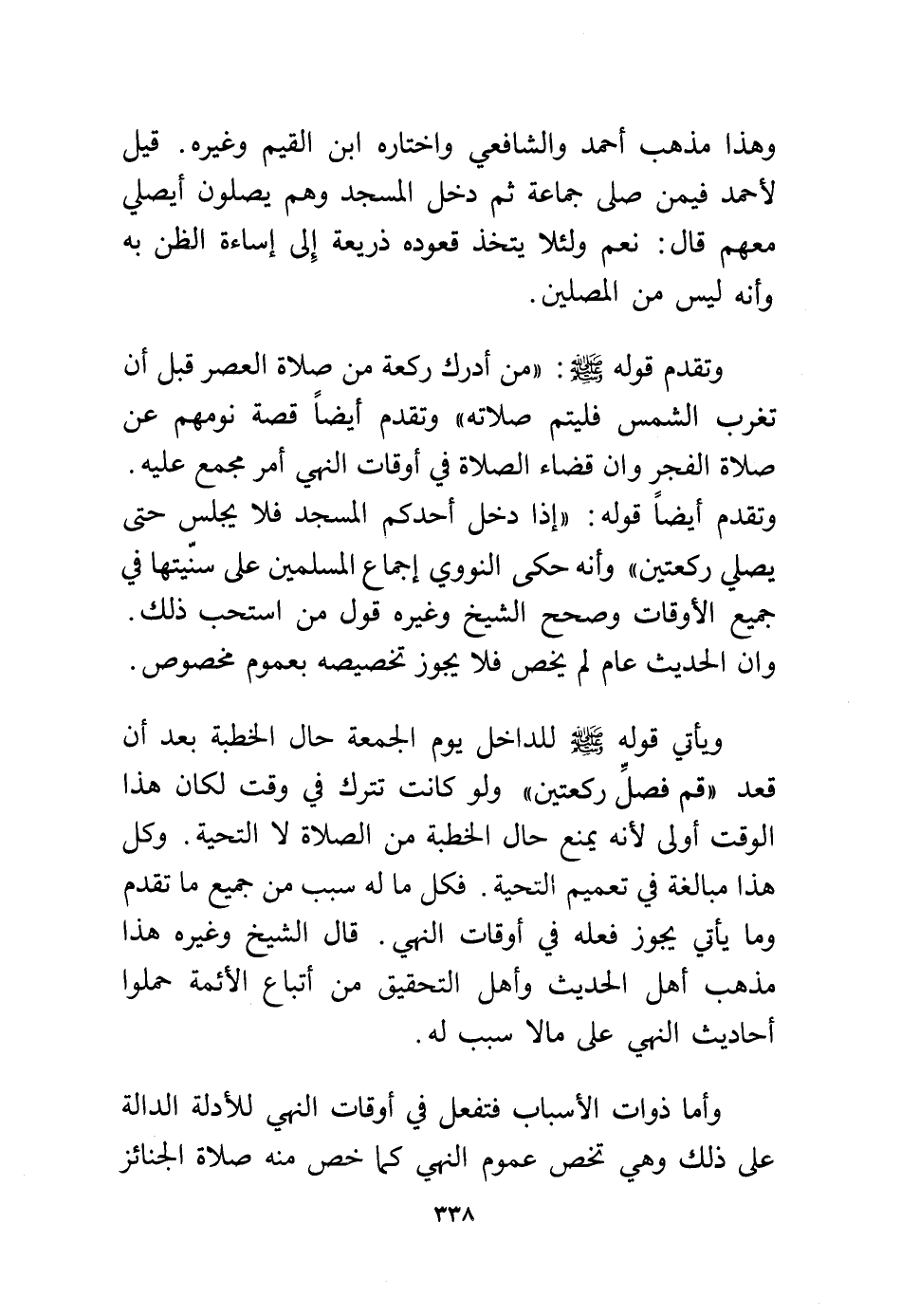 ويأتي قوله - صلى الله عليه وسلم - للداخل يوم الجمعة حال الخطبة بعد أن قعد "قم فصل ركعتين" ولو كانت تترك في وقت لكان هذا الوقت أولى لأنه يمنع حال الخطبة من الصلاة لا التحية. وكل هذا مبالغة في تعميم التحية. فكل ما له سبب من جميع ما تقدم وما يأتي يجوز فعله في أوقات النهي. قال الشيخ وغيره هذا مذهب أهل الحديث وأهل التحقيق من أتباع الأئمة حملوا أحاديث النهي على مالا سبب له.