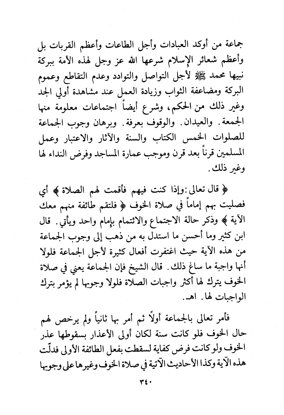 (قال تعالى: {وَإِذَا كُنتَ فِيهِمْ فَأَقَمْتَ لَهُمُ الصَّلاَةَ} أي فصليت بهم إمامًا في صلاة الخوف {فَلْتَقُمْ طَآئِفَةٌ مِّنْهُم مَّعَكَ} الآية وذكر حالة الاجتماع والائتمام بإمام واحد ويأتي. قال ابن كثير وما أحسن ما استدل به من ذهب إلى وجوب الجماعة من هذه الآية حيث اغتفرت أفعال كثيرة لأجل الجماعة فلولا أنها واجبة ما ساغ ذلك. قال الشيخ فإن الجماعة يعني في صلاة الخوف يترك لها أكثر واجبات الصلاة فلولا وجوبها لم يؤمر بترك الواجبات لها. اهـ.