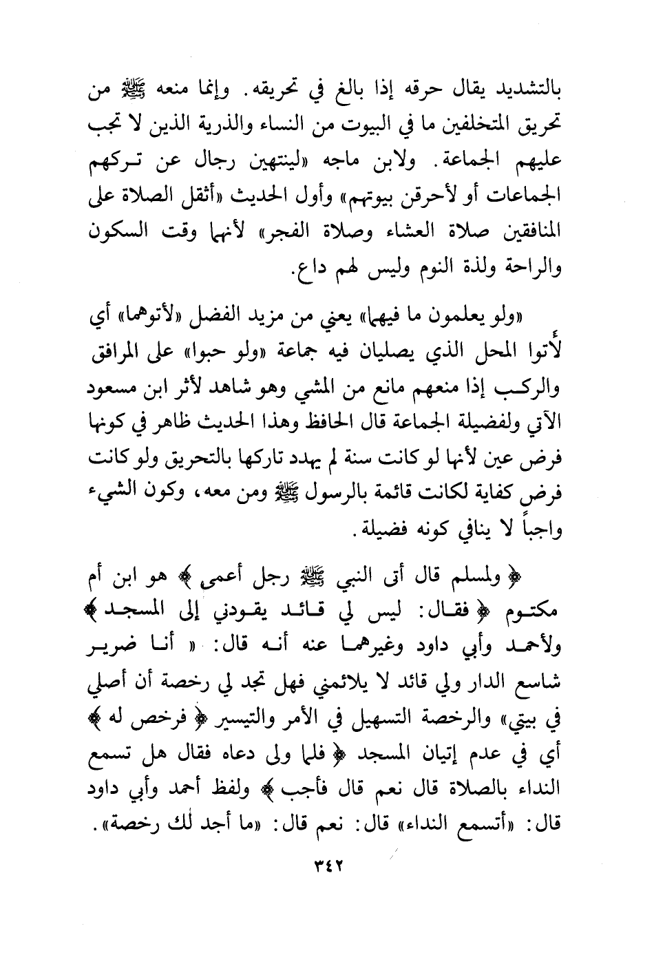 (ولمسلم قال أتى النبي – - صلى الله عليه وسلم - رجل أعمى) هو ابن أم مكتوم (فقال: ليس لي قائد يقودني إلى المسجد) ولأحمد وأبي داود وغيرهما عنه أنه قال: "أنا ضرير شاسع الدار ولي قائد لا يلائمني فهل تجد لي رخصة أن أصلي في بيتي" والرخصة التسهيل في الأمر والتيسير (فرخص له) أي في عدم إتيان المسجد (فلما ولى دعاه فقال هل تسمع النداء بالصلاة قال نعم قال فأجب) ولفظ أحمد وأبي داود قال: "أتسمع النداء" قال: نعم قال: "ما أجد لك رخصة".