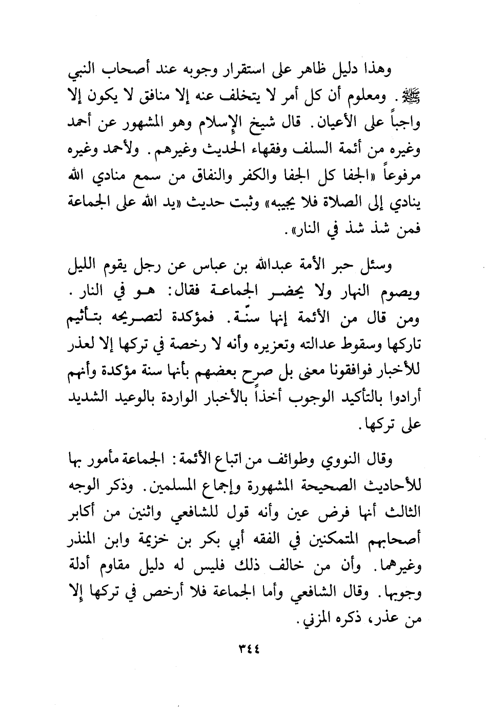 وهذا دليل ظاهر على استقرار وجوبه عند أصحاب النبي – - صلى الله عليه وسلم - ومعلوم أن كل أمر لا يتخلف عنه إلا منافق لا يكون إلا واجبًا على الأعيان. قال شيخ الإسلام وهو المشهور عن أحمد وغيره من أئمة السلف وفقهاء الحديث وغيرهم. ولأحمد وغيره مرفوعًا "الجفا كل الجفا والكفر والنفاق من سمع منادي الله ينادي إلى الصلاة فلا يجيبه" وثبت حديث "يد الله على الجماعة فمن شذ شذ في النار".