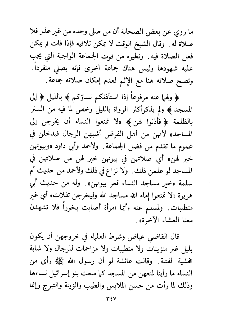 قال القاضي عياض وشرط العلماء في خروجهن أن يكون بليل غير متزينات ولا متطيبات ولا مزاحمات للرجال ولا شابة مخشية الفتنة. وقالت عائشة لو أن رسول الله - صلى الله عليه وسلم - رأي من النساء ما رأينا لمنعهن من المسجد كما منعت بنو إسرائيل نساءها وذلك لما رأت من حسن الملابس والطيب والزينة والتبرج وإنما