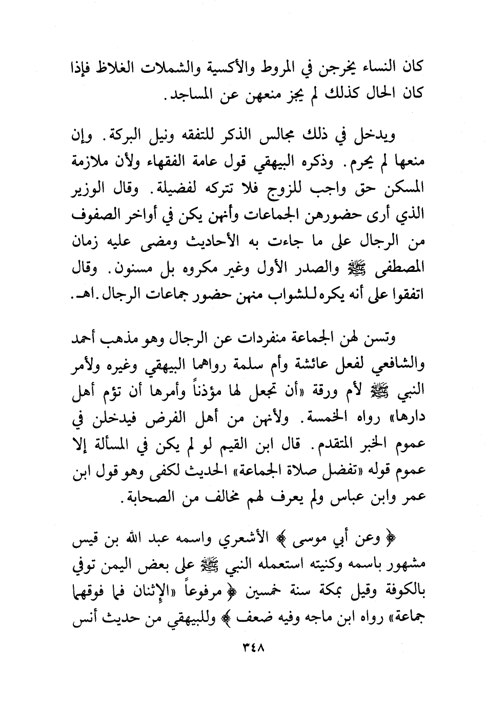 وتسن لهن الجماعة منفردات عن الرجال وهو مذهب أحمد والشافعي لفعل عائشة وأم سلمة رواهما البيهقي وغيره ولأمر النبي – - صلى الله عليه وسلم - لأم ورقة "أن تجعل لها مؤذنًا وأمرها أن تؤم أهل دارها" رواه الخمسة. ولأنهن من أهل الفرض فيدخلن في عموم الخبر المتقدم. قال ابن القيم لو لم يكن في المسألة إلا عموم قوله "تفضل صلاة الجماعة" الحديث لكفى وهو قول ابن عمر وابن عباس ولم يعرف لهم مخالف من الصحابة.