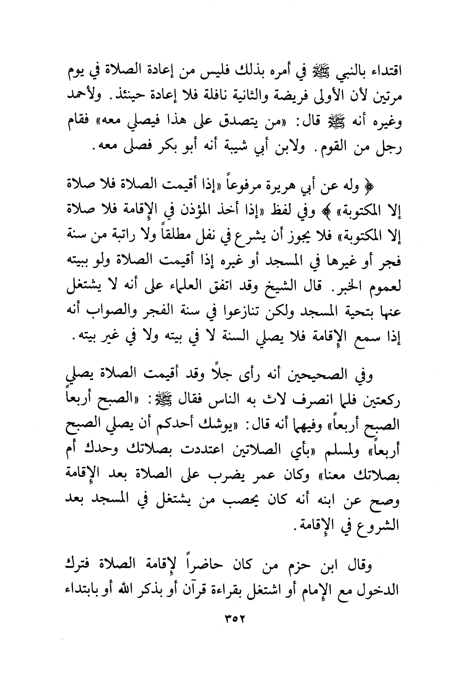 (وله عن أبي هريرة مرفوعًا "إذا أقيمت الصلاة فلا صلاة إلا المكتوبة") وفي لفظ "إذا أخذ المؤذن في الإقامة فلا صلاة إلا المكتوبة" فلا يجوز أن يشرع في نفل مطلقًا ولا راتبة من سنة فجر أو غيرها في المسجد أو غيره إذا أقيمت الصلاة ولو ببيته لعموم الخبر. قال الشيخ وقد اتفق العلماء على أنه لا يشتغل عنها بتحية المسجد ولكن تنازعوا في سنة الفجر والصواب أنه إذا سمع الإقامة فلا يصلي السنة لا في بيته ولا في غير بيته.