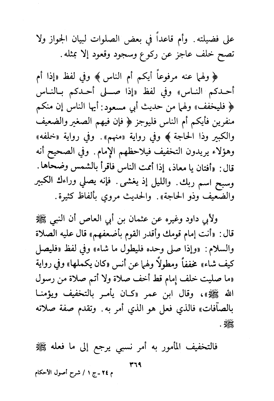 ولأبي داود وغيره عن عثمان بن أبي العاص أن النبي – - صلى الله عليه وسلم - قال: "أنت إمام قومك وأقدر القوم بأضعفهم" قال عليه الصلاة والسلام: "وإذا صلى وحده فليطول ما شاء" وفي لفظ "فليصل كيف شاء" مخففًا ومطولاً ولهما عن أنس "كان يكملها" وفي رواية "ما صليت خلف إمام قط أخف صلاة ولا أتم صلاة من رسول الله – - صلى الله عليه وسلم - " وقال ابن عمر "كان يأمر بالتخفيف ويؤمنا بالصافات" فالذي فعل هو الذي أمر به. وتقدم صفة صلاته - صلى الله عليه وسلم -.