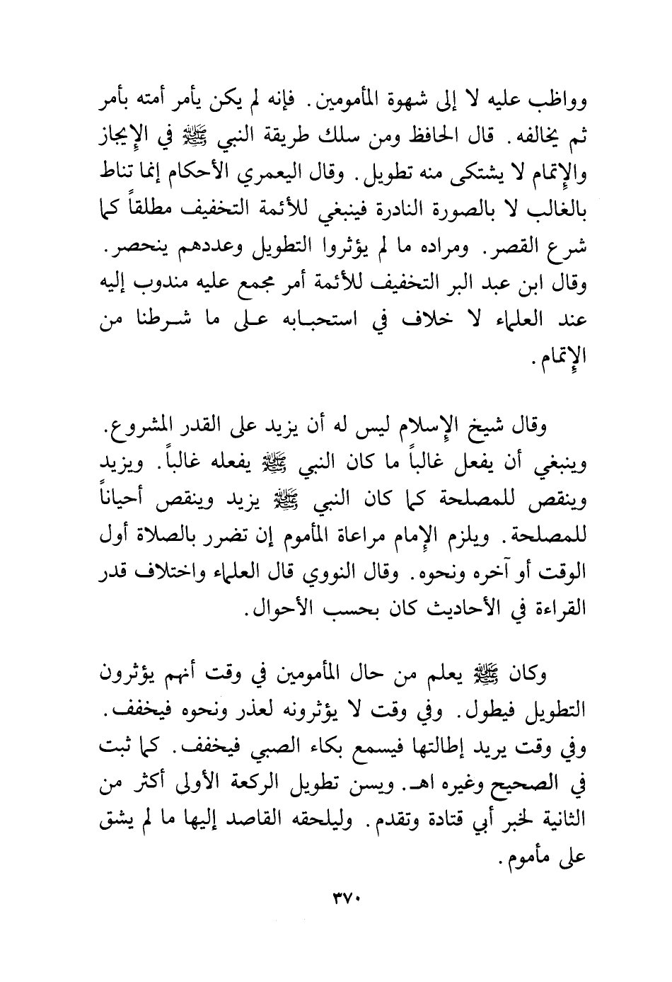وقال شيخ الإسلام ليس له أن يزيد على القدر المشروع. وينبغي أن يفعل غالبًا ما كان النبي - صلى الله عليه وسلم - يفعله غالبًا. ويزيد وينقص للمصلحة كما كان النبي - صلى الله عليه وسلم - يزيد وينقص أحيانًا للمصلحة. ويلزم الإمام مراعاة المأموم إن تضرر بالصلاة أول الوقت أو آخره ونحوه. وقال النووي قال العلماء واختلاف قدر القراءة في الأحاديث كان بحسب الأحوال.