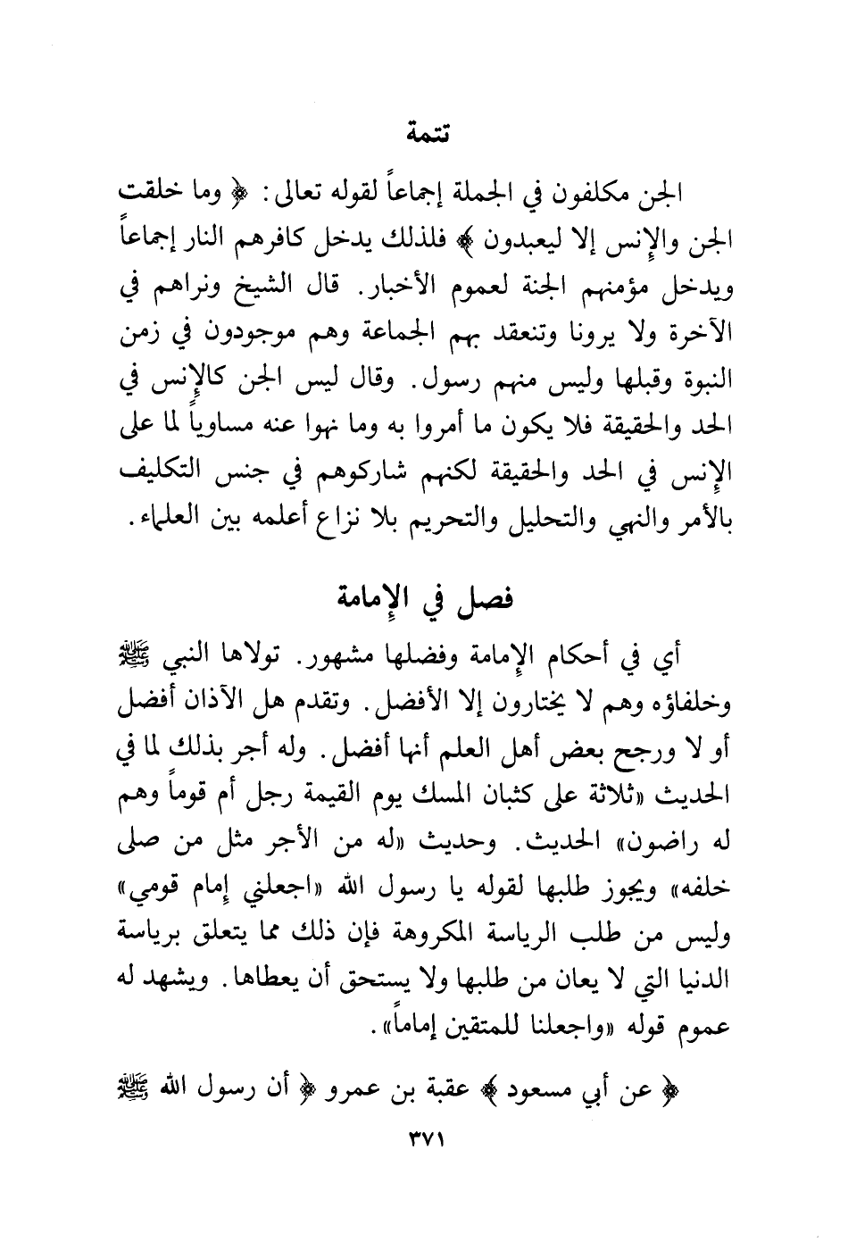 الجن مكلفون في الجملة إجماعًا لقوله تعالى: {وَمَا خَلَقْتُ الْجِنَّ وَالإِنسَ إِلاَّ لِيَعْبُدُون} فلذلك يدخل كافرهم النار إجماعًا ويدخل مؤمنهم الجنة لعموم الأخبار. قال الشيخ ونراهم في الآخرة ولا يرونا وتنعقد بهم الجماعة وهم موجودون في زمن النبوة وقبلها وليس منهم رسول. وقال ليس الجن كالإنس في الحد والحقيقة فلا يكون ما أمروا به وما نهوا عنه مساويًا لما على الإنس في الحد والحقيقة لكنهم شاركوهم في جنس التكليف بالأمر والنهي والتحليل والتحريم بلا نزاع أعلمه بين العلماء.