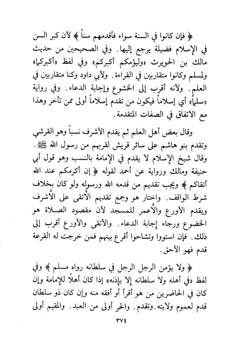 (فإن كانوا في الهجرة سواء فأقدمهم سنًا) لأن كبر السن في الإسلام فضيلة يرجع إليها. وفي الصحيحين من حديث مالك بن الحويرث "وليؤمكم أكبركم" وفي لفظ "أكبركما" ولمسلم وكانوا متقاربين في القراءة. ولأبي داود وكنا متقاربين في العلم. ولأنه أقرب إلى الخشوع وإجابة الدعاء. وفي رواية "سلمًا" أي إسلامًا فيكون من تقدم إسلامًا أولى ممن تأخر وهذا مع الاتفاق في الصفات المتقدمة.