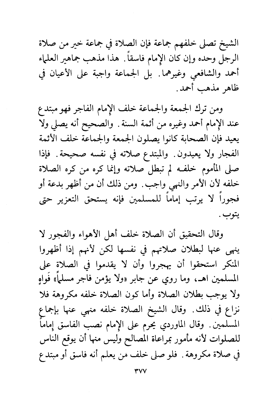 ومن ترك الجمعة والجماعة خلف الإمام الفاجر فهو مبتدع عند الإمام أحمد وغيره من أئمة السنة. والصحيح أنه يصلي ولا يعيد فإن الصحابة كانوا يصلون الجمعة والجماعة خلف الأئمة الفجار ولا يعيدون. والمبتدع صلاته في نفسه صحيحة. فإذا صلى المأموم خلفه لم تبطل صلاته وإنما كره من كره الصلاة خلفه لأن الأمر والنهي واجب. ومن ذلك أن من أظهر بدعة أو فجورًا لا يرتب إمامًا للمسلمين فإنه يستحق التعزير حتى يتوب.