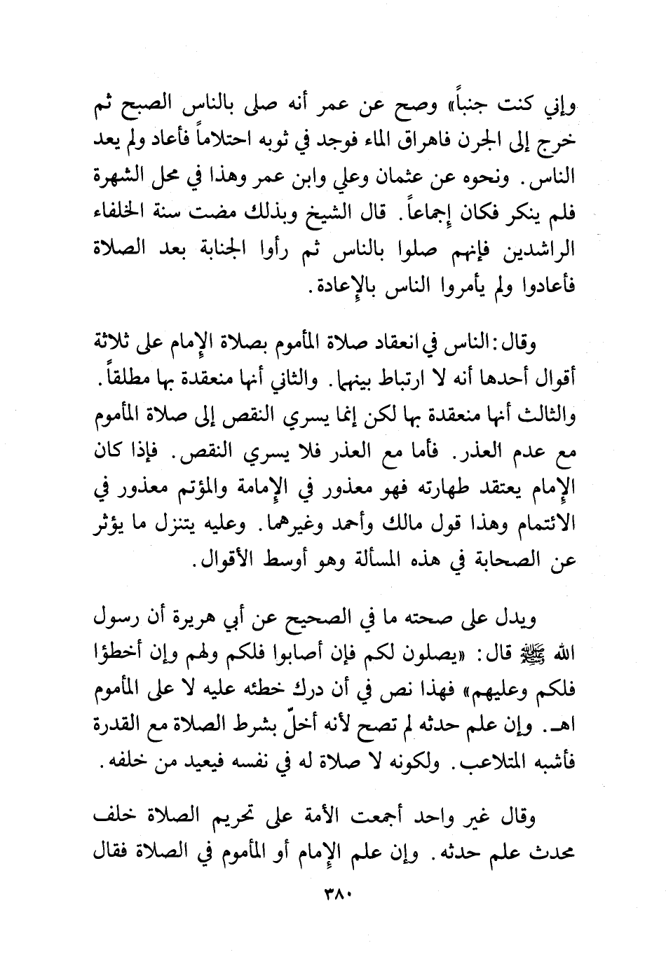 وإني كنت جنبًا" وصح عن عمر أنه صلى بالناس الصبح ثم خرج إلى الجرن فاهراق الماء فوجد في ثوبه احتلامًا فأعاد ولم يعد الناس. ونحوه عن عثمان وعلي وابن عمر وهذا في محل الشهرة فلم ينكر فكان إجماعًا. قال الشيخ وبذلك مضت سنة الخلفاء الراشدين فإنهم صلوا بالناس ثم رأوا الجنابة بعد الصلاة فأعادوا ولم يأمروا الناس بالإعادة.