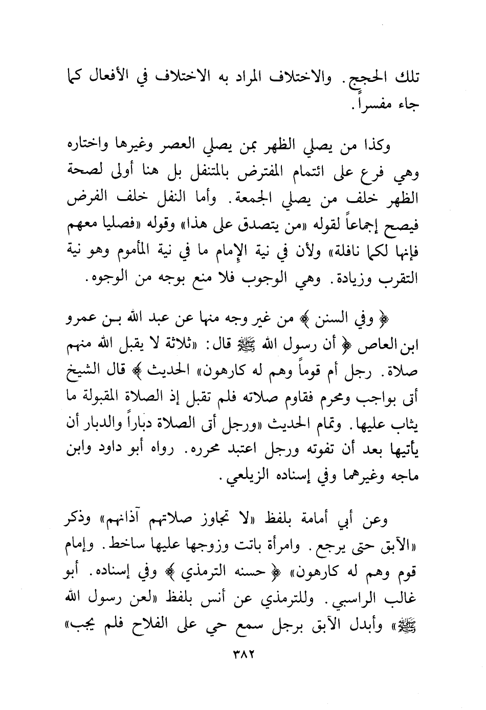 (وفي السنن) من غير وجه منها عن عبد الله بن عمرو ابن العاص (أن رسول الله – - صلى الله عليه وسلم - قال: "ثلاثة لا يقبل الله منهم صلاة. رجل أم قومًا وهم له كارهون" الحديث) قال الشيخ أتى بواجب ومحرم فقاوم صلاته فلم تقبل إذ الصلاة المقبولة ما يثاب عليها. وتمام الحديث "ورجل أتى الصلاة دبارًا والدبار أن يأتيها بعد أن تفوته ورجل اعتبد محرره. رواه أبو داود وابن ماجه وغيرهما وفي إسناده الزيلعي.