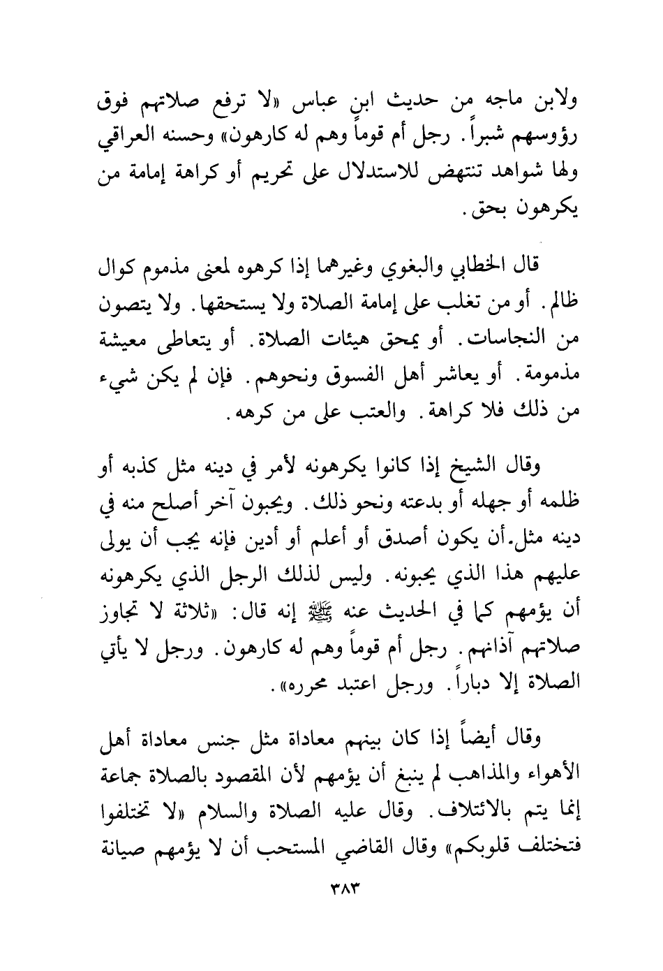 وقال الشيخ إذا كانوا يكرهونه لأمر في دينه مثل كذبه أو ظلمه أو جهله أو بدعته ونحو ذلك. ويحبون آخر أصلح منه في دينه مثل أن يكون أصدق أو أعلم أو أدين فإنه يجب أن يولى عليهم هذا الذي يحبونه. وليس لذلك الرجل الذي يكرهونه أن يؤمهم كما في الحديث عنه – - صلى الله عليه وسلم - إنه قال: "ثلاثة لا تجاوز صلاتهم أذانهم. رجل أم قومًا وهم له كارهون. ورجل لا يأتي الصلاة إلا دبارًا. ورجل اعتبد محرره".