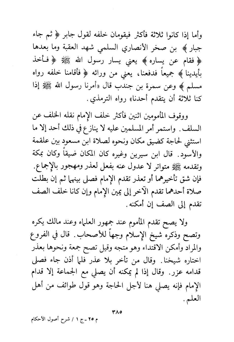 ووقوف المأمومين اثنين فأكثر خلف الإمام نقله الخلف عن السلف. واستمر أمر المسلمين عليه لا ينازع في ذلك أحد إلا ما استثني لحاجة كضيق مكان ونحوه لصلاة ابن مسعود بين علقمة والأسود. قال ابن سيرين وغيره كان المكان ضيقًا وكان بمكة وتقدمه – - صلى الله عليه وسلم - متواتر لا عدول عنه بفعل لعذر ومهجور بالإجماع.