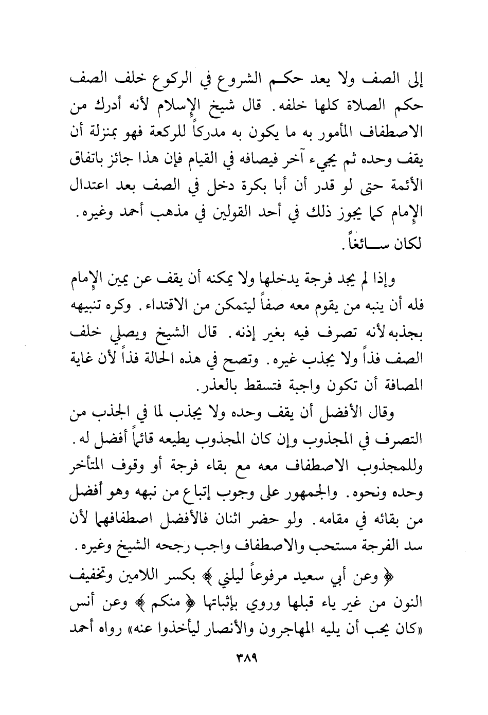 إلى الصف ولا يعد حكم الشروع في الركوع خلف الصف حكم الصلاة كلها خلفه. قال شيخ الإسلام لأنه أدرك من الاصطفاف المأمور به ما يكون به مدركًا للركعة فهو بمنزلة أن يقف وحده ثم يجيء آخر فيصافه في القيام فإن هذا جائز باتفاق الأئمة حتى لو قدر أن أبا بكرة دخل في الصف بعد اعتدال الإمام كما يجوز ذلك في أحد القولين في مذهب أحمد وغيره. لكان سائغًا.