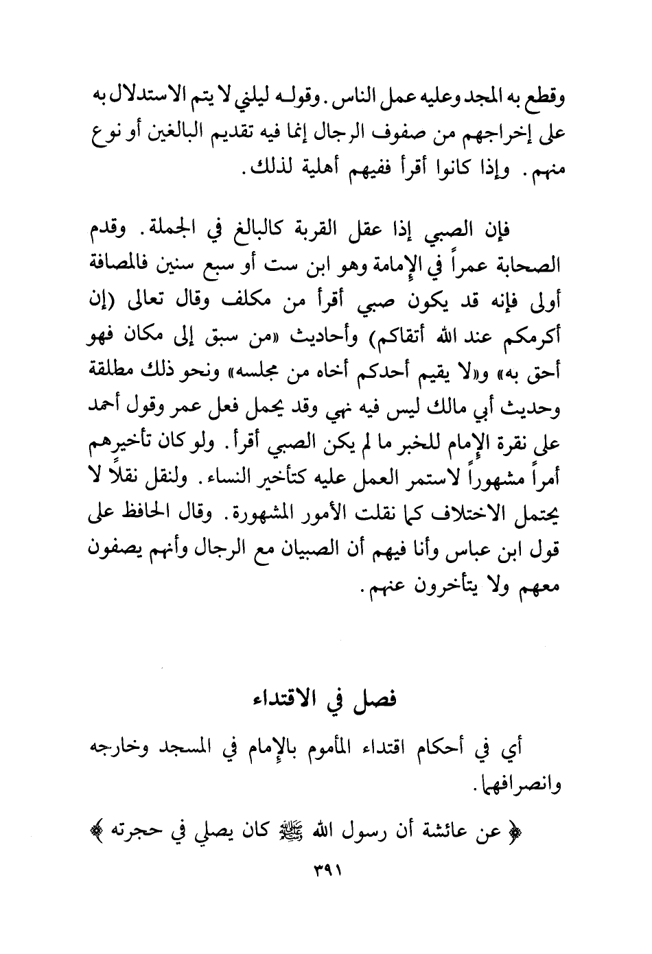 فإن الصبي إذا عقل القربة كالبالغ في الجملة وقدم الصحابة عمرًا في الإمامة وهو ابن ست أو سبع سنين فالمصافة أولى فإنه قد يكون صبي أقرأ من مكلف وقال تعالى: {إِنَّ أَكْرَمَكُمْ عِندَ اللَّهِ أَتْقَاكُمْ} وأحاديث "من سبق إلى مكان فهو أحق به" و "لا يقيم أحدكم أخاه من مجلسه" ونحو ذلك مطلقة وحديث أبي مالك ليس فيه نهي وقد يحمل فعل عمر وقول أحمد على نقرة الإمام للخبر ما لم يكن الصبي أقرأ. ولو كان تأخيرهم أمرًا مشهورًا لاستمر العمل عليه كتأخير النساء. ولنقل نقلاً لا يحتمل الاختلاف كما نقلت الأمور المشهورة. وقال الحافظ على قول ابن عباس وأنا فيهم أن الصبيان مع الرجال وأنهم يصفون معهم ولا يتأخرون عنهم.