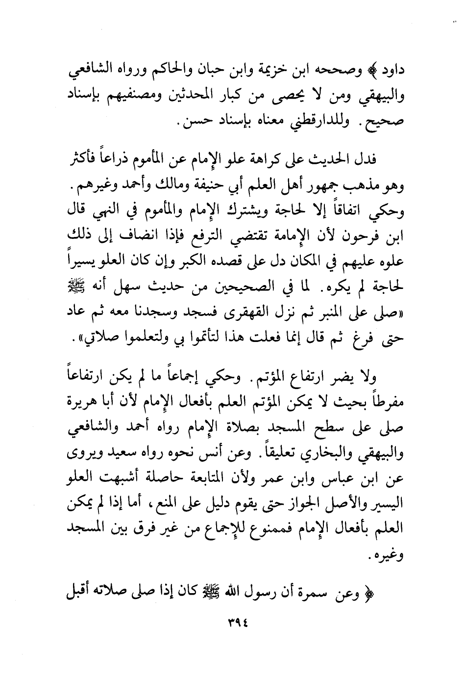 وحكى اتفاقًا إلا لحاجة ويشترك الإمام والمأموم في النهي قال ابن فرحون لأن الإمامة تقتضي الترفع فإذا انضاف إلى ذلك علوه عليهم في المكان دل على قصده الكبر وإن كان العلو يسيرًا لحاجة لم يكره. لما في الصحيحين من حديث سهل أنه – - صلى الله عليه وسلم - "صلى على المنبر ثم نزل القهقري فسجد وسجدنا معه ثم عاد حتى فرغ ثم قال إنما فعلت هذا لتأتموا بي ولتعلموا صلاتي".