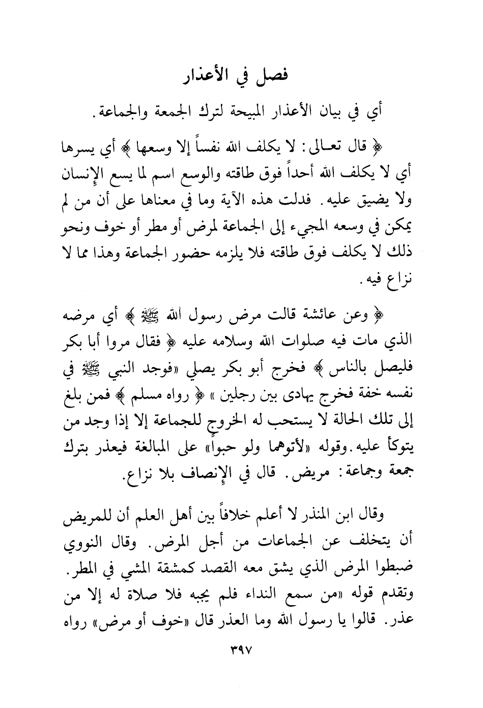 (قال تعالى: {لاَ يُكَلِّفُ اللهُ نَفْسًا إِلاَّ وُسْعَهَا} أي يسرها أي لا يكلف الله أحدًا فوق طاقته والوسع اسم لما يسع الإنسان ولا يضيق عليه فدلت هذه الآية وما في معناها على أن من لم يمكن في وسعه المجيء إلى الجماعة لمرض أو مطر أو خوف ونحو ذلك لا يكلف فوق طاقته فلا يلزمه حضور الجماعة وهذا مما لا نزاع فيه.
